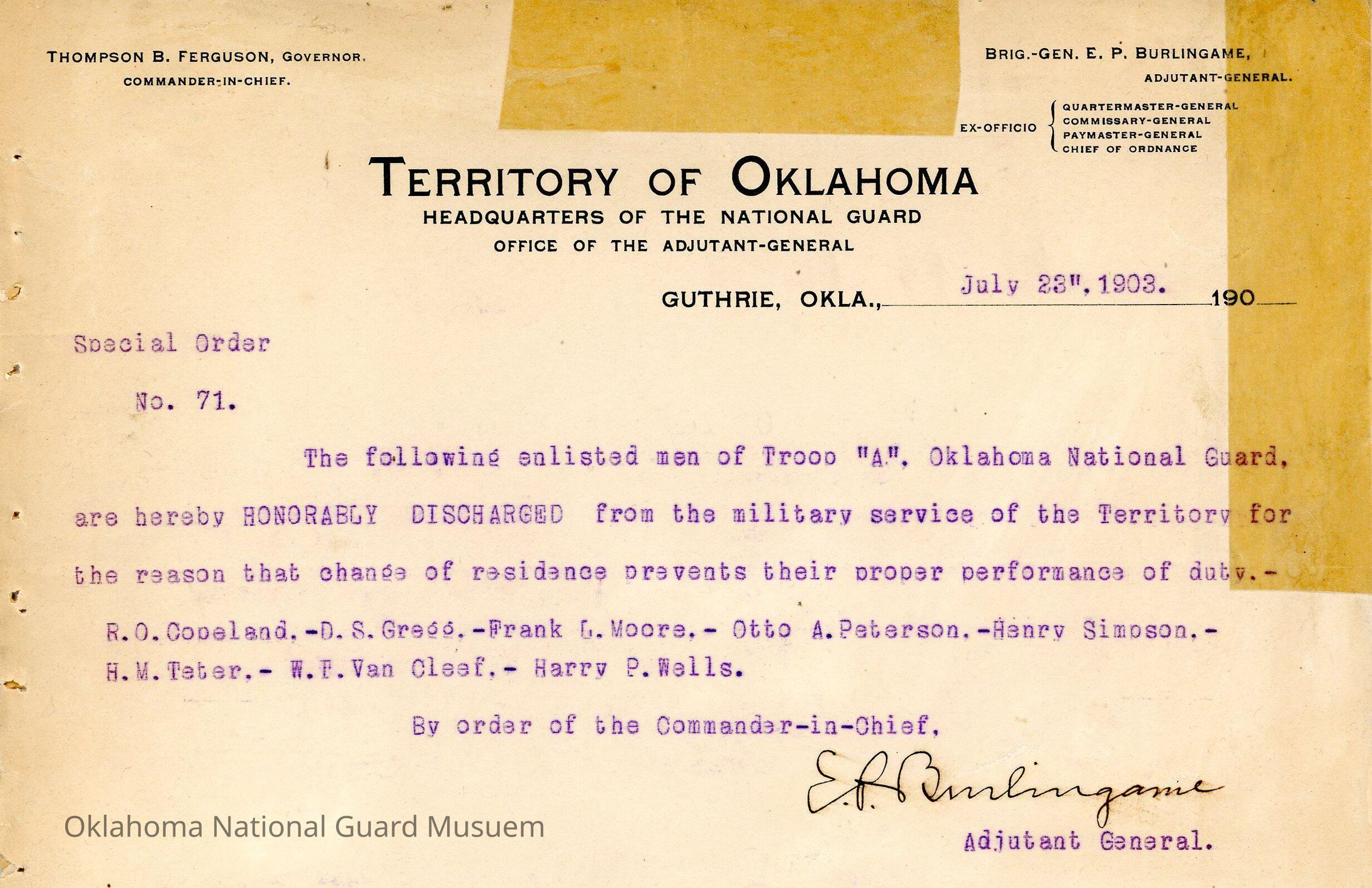 Special Order #71 from Headquarters Adjutant General's Office in Guthrie. The order lists the men who are honorably discharged from First Regiment Troop ADate(s) of Creation