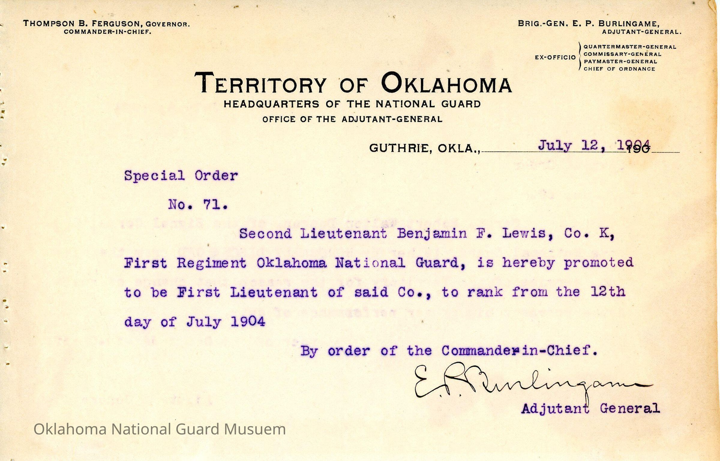 Adjutant General, Guthrie, E.P. Burlingame, Thompson B. Ferguson, First Regiment, Promotions, Benjamin F. Lewis