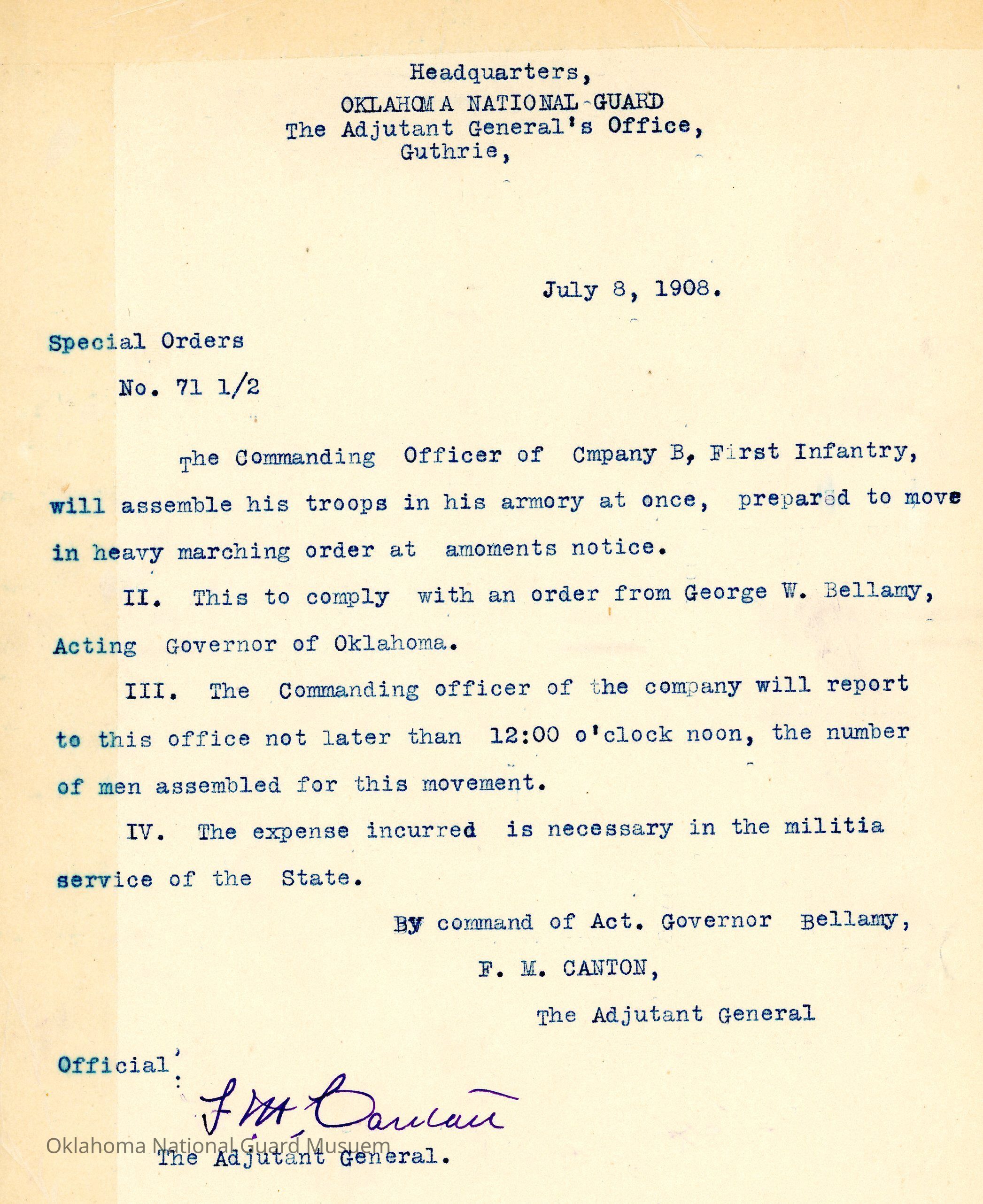 Special Order #71.5 from Headquarters Adjutant General's Office in Guthrie. The order instructs Company B First Infantry to be assembled at once at the armory and prepared to move, in heavy marching, at a moment's noticeDate(s) of Creation