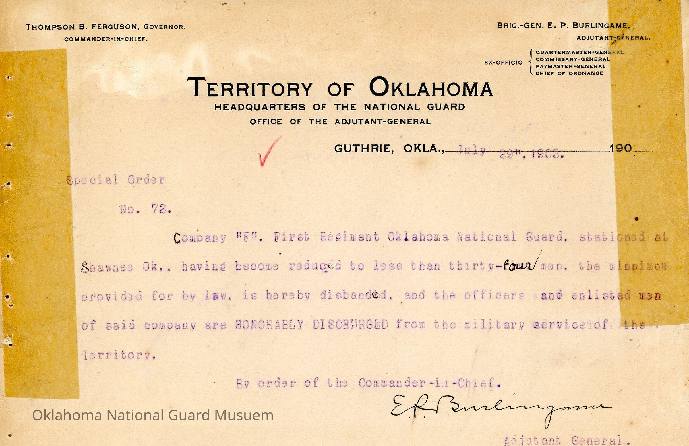 Special Order #72 from Headquarters Adjutant General's Office in Guthrie. The order disbands Company F First Regiment stationed in ShawneeDate(s) of Creation