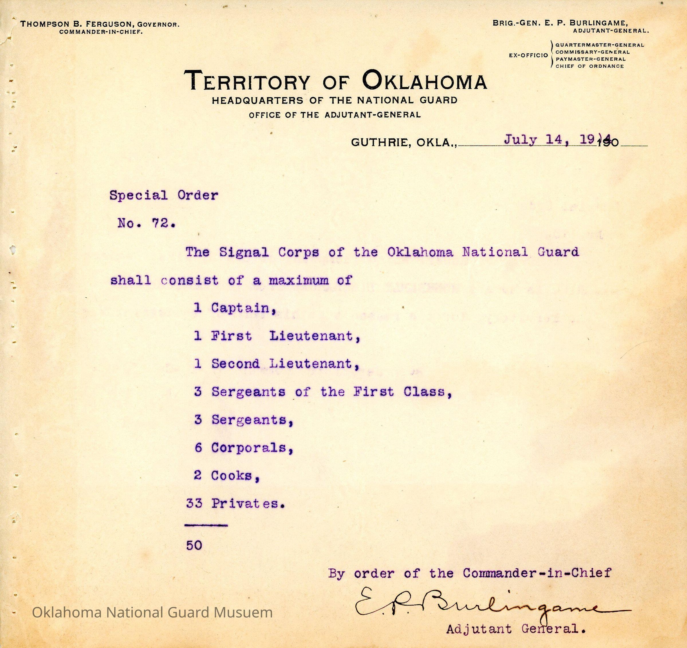 Special Order #72 from Headquarters Adjutant General's Office in Guthrie. The order notes the composition of the Signal Corps and its max strengthDate(s) of Creation