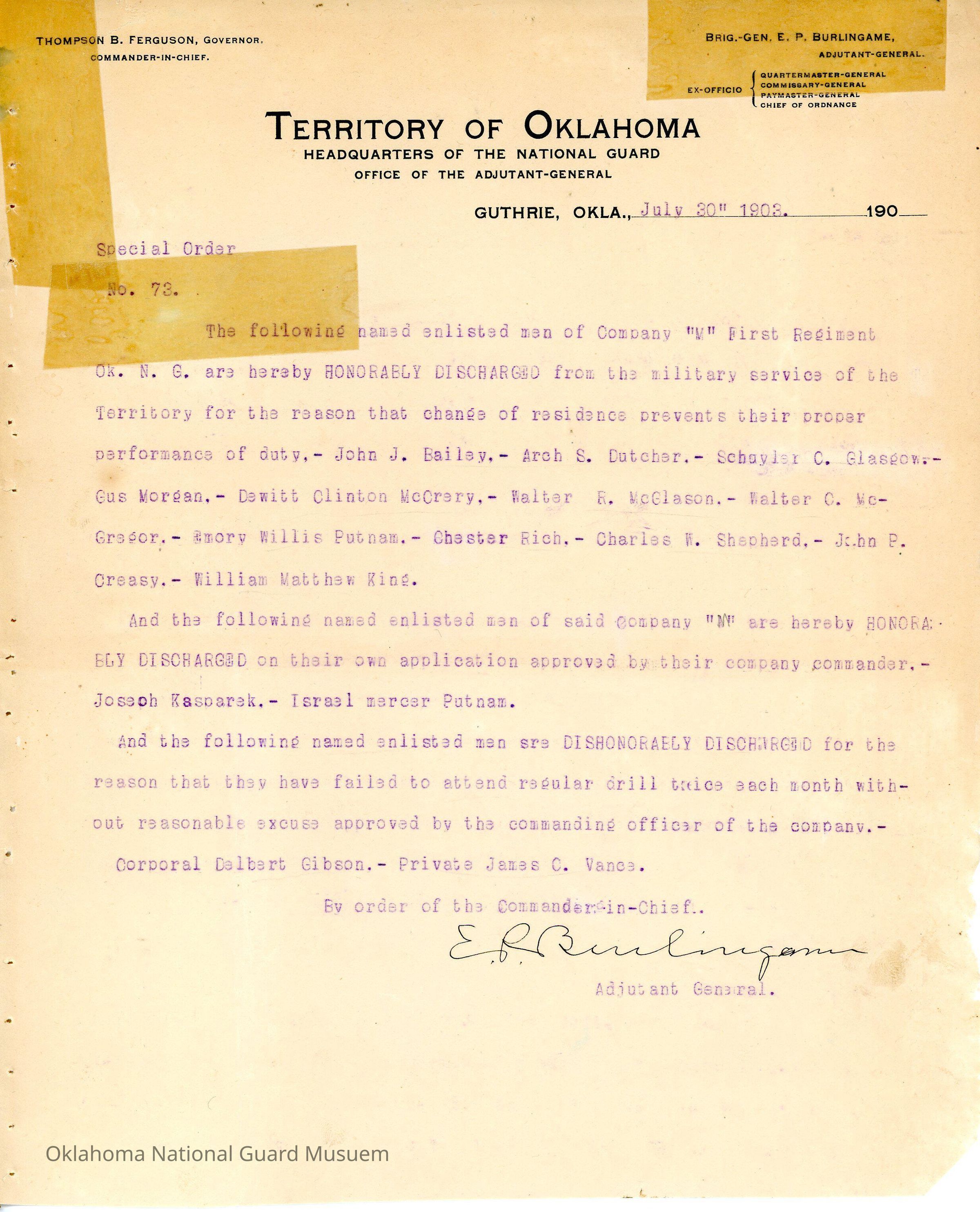 Adjutant General, Guthrie, E.P. Burlingame, Thompson B. Ferguson, Honorable discharge, First Regiment, John J. Bailey, Arch S. Dutcher, Schuyler C. Glasgow, Gus Morgan, Dewitt Clinton McCrery, Walter R. McGlason, Walter C. McGregor, Emory Willis Putnam, Chester Rich, Charles W. Shepherd, John P. Creasy, William Matthew King, Joseph Kasparek, Israel Mercer Putnam, Delbert Gibson, James C. Vance