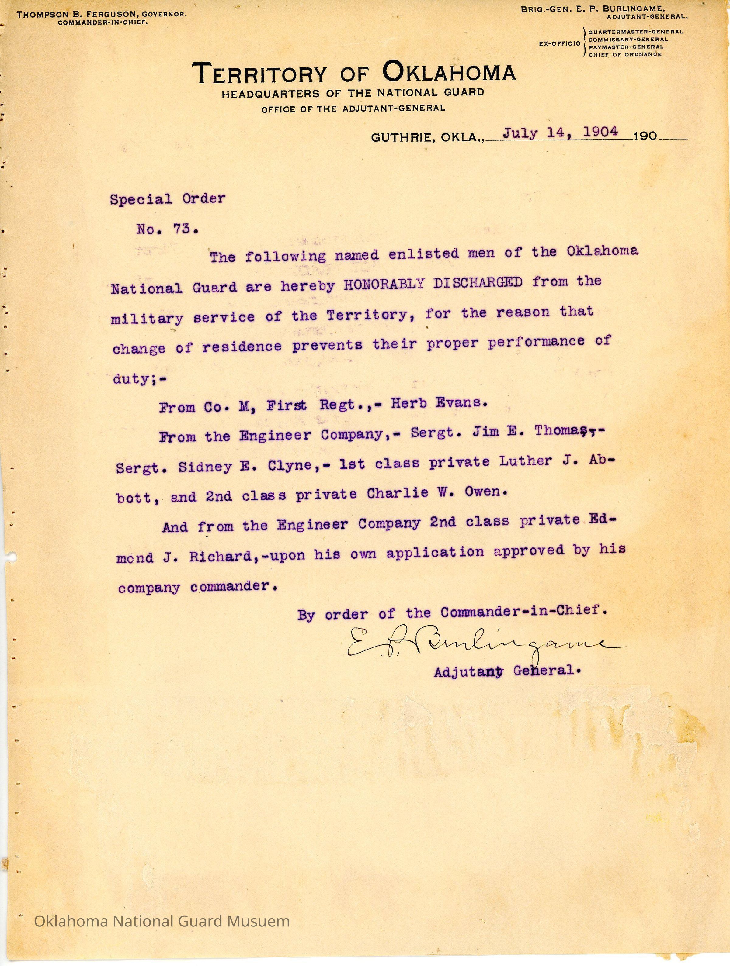 Adjutant General, Guthrie, E.P. Burlingame, Thompson B. Ferguson, First Regiment, Honorable discharges, Engineer Company, Herb Evans, Jim E. Thomas, Sidney E. Clyne, Luther J. Abbott, Charlie W. Owen, Edmond J. Richard