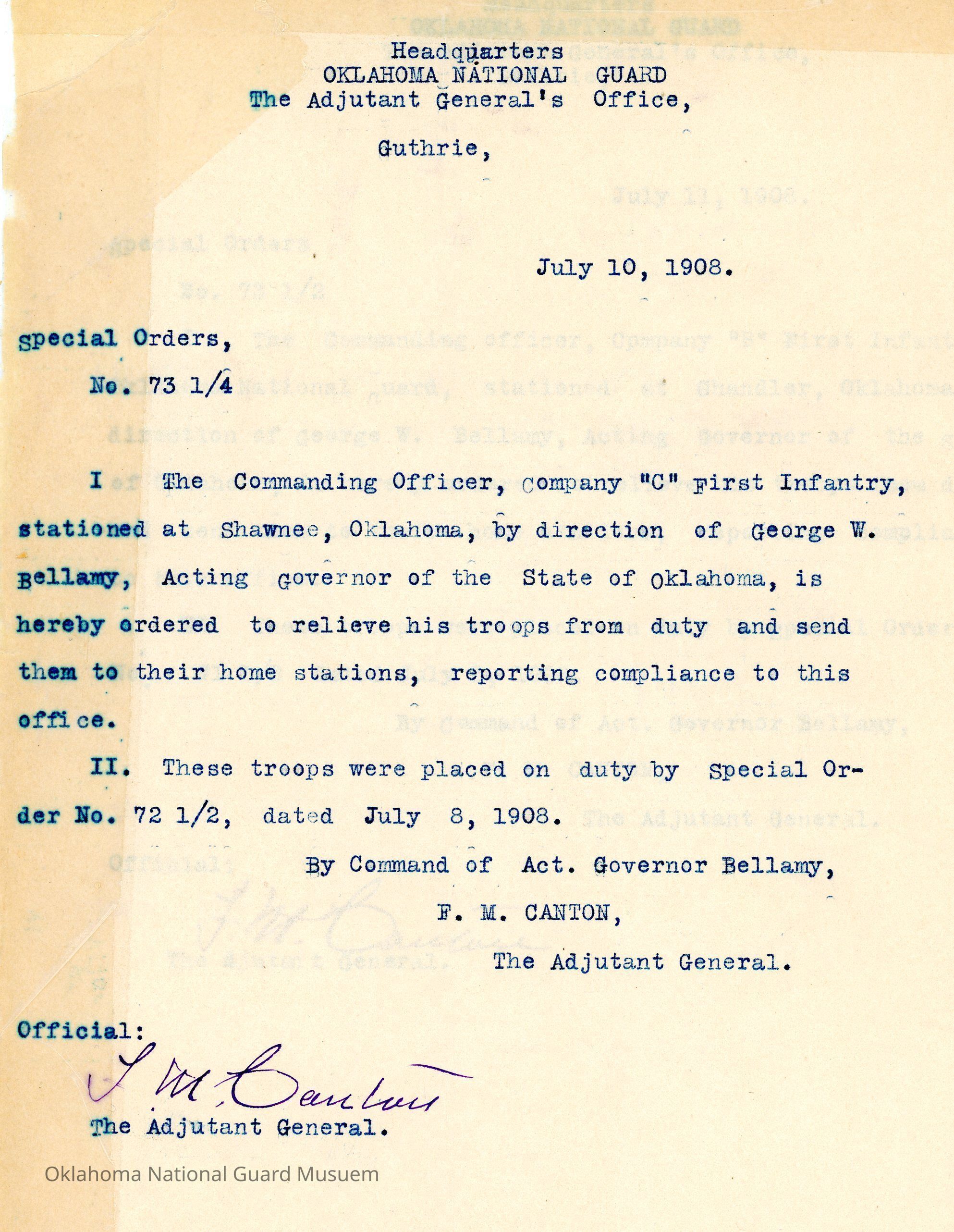 Adjutant General, Guthrie, Frank Canton, George W. Bellamy, First Infantry, Acting Governor, Shawnee