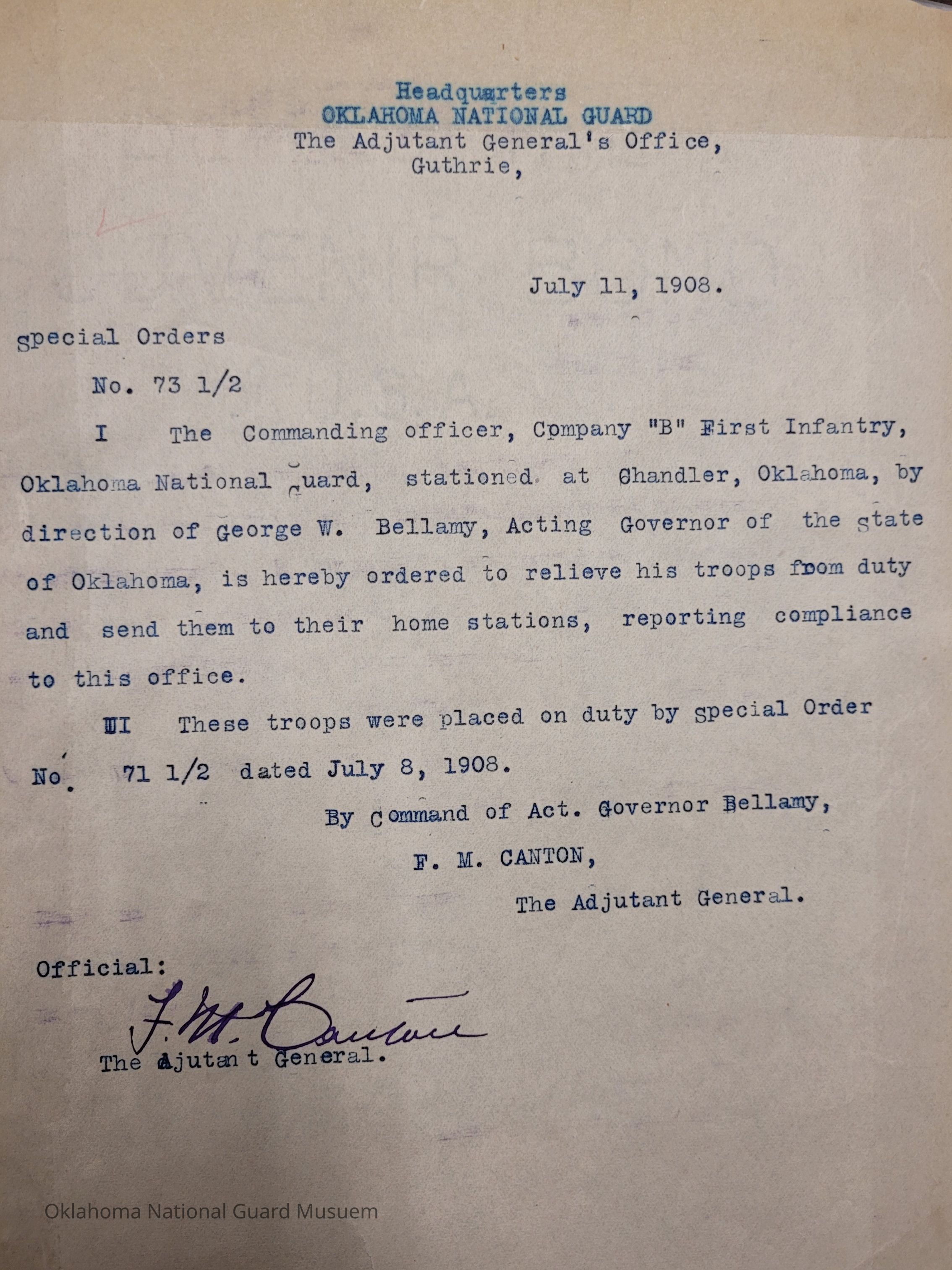 Special Order #73.5 from Headquarters Adjutant General's Office in Guthrie. The order instructs Company B First Infantry to be returned to their home stationDate(s) of Creation