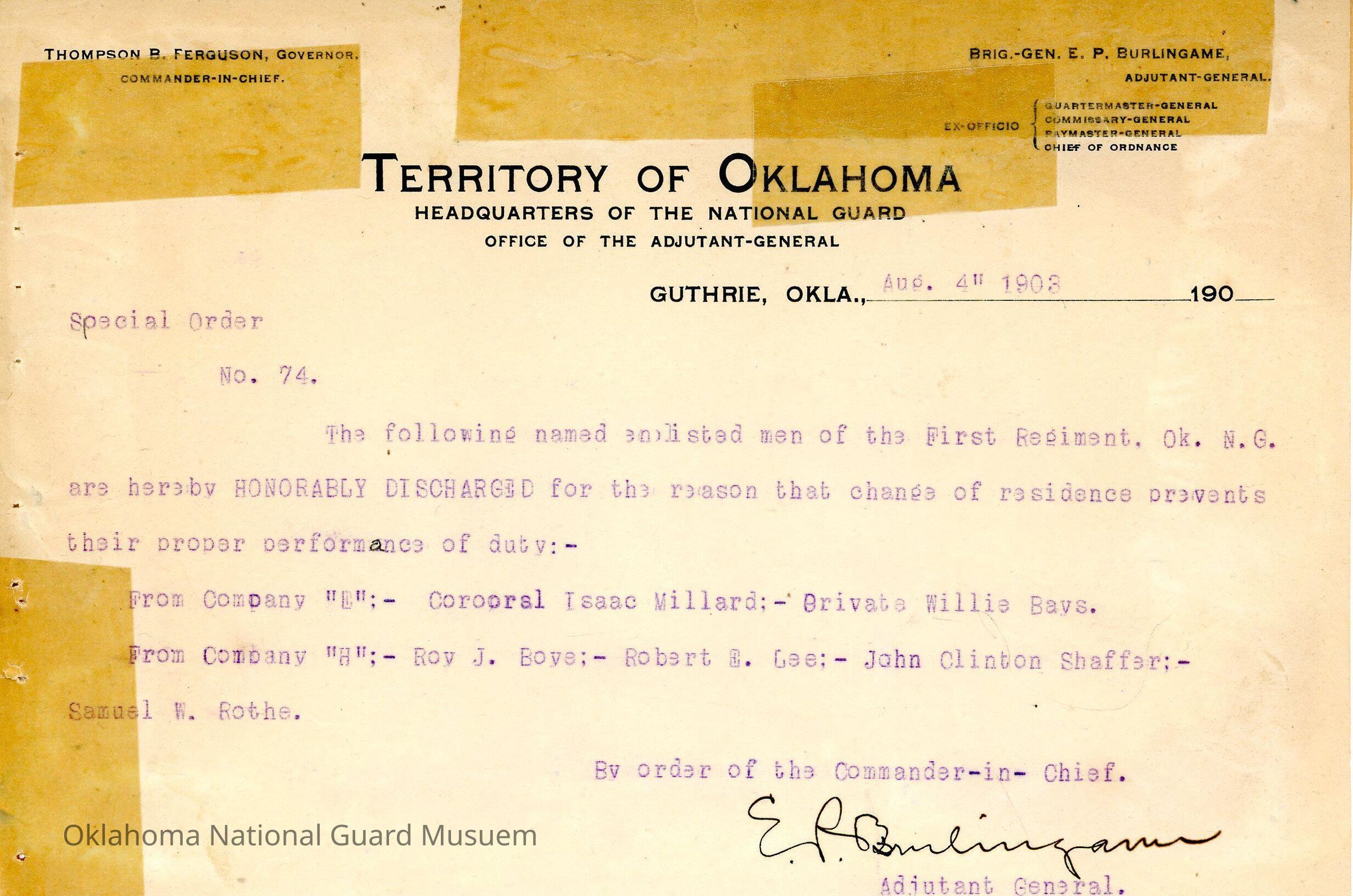 Adjutant General, Guthrie, E.P. Burlingame, Thompson B. Ferguson, Honorable discharge, First Regiment, Isaac Millard, Willie Bays, Roy J. Bove, Robert E. Lee, John Clinton Shaffer, Samuel W. Rothe