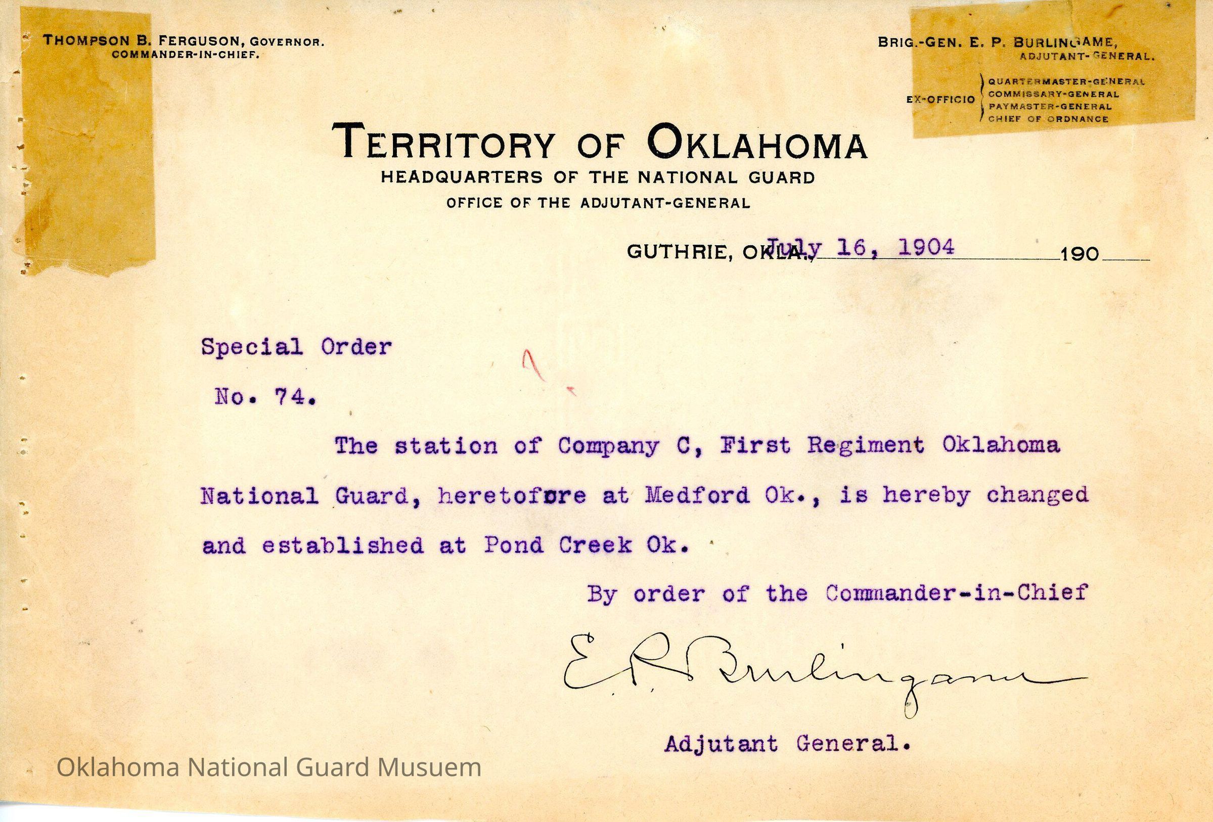 Adjutant General, Guthrie, E.P. Burlingame, Thompson B. Ferguson, First Regiment, Station, Change of Station, Medford, Pond Creek
