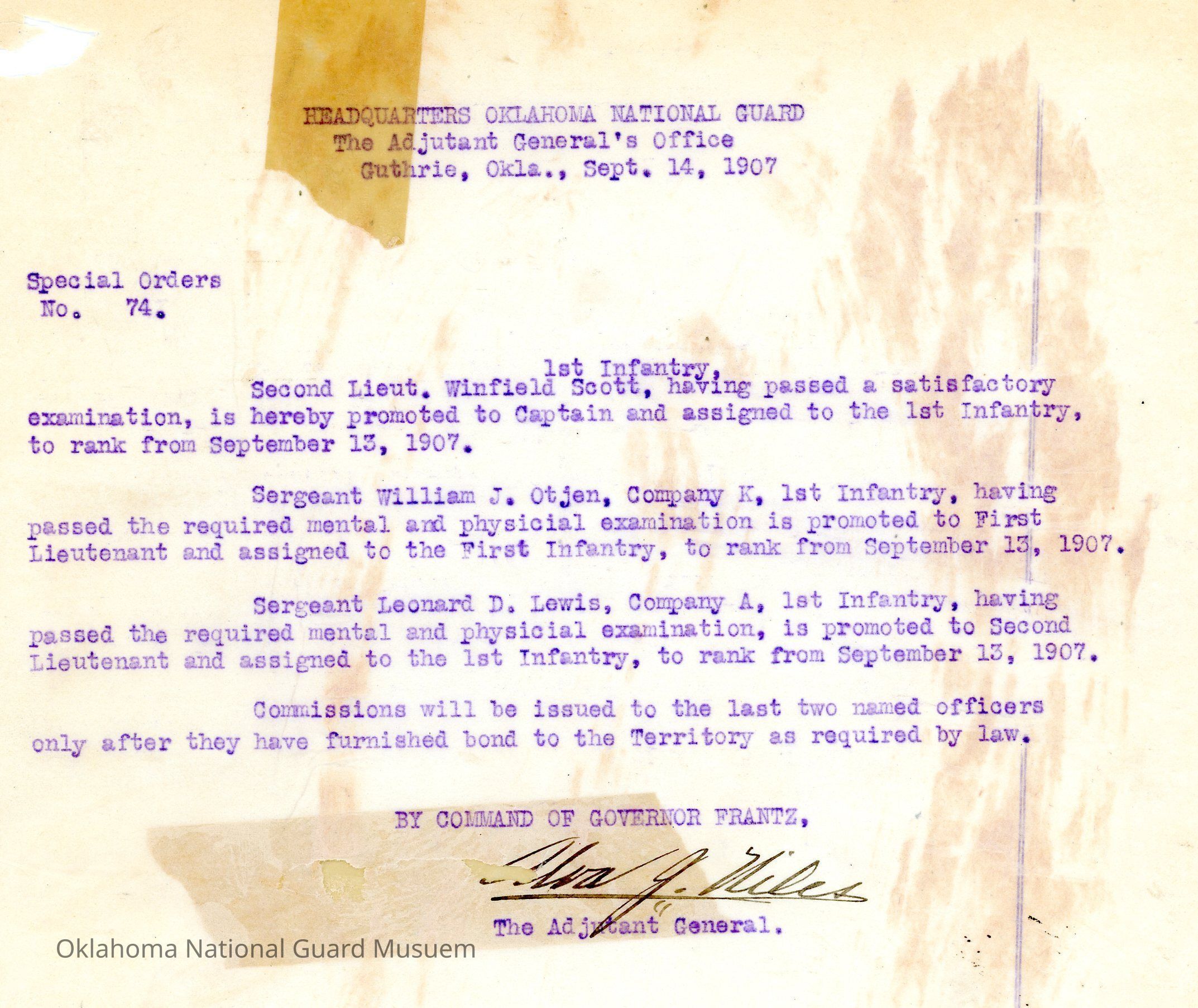 Adjutant General, Guthrie, Alva J. Niles, First Infantry, Promotions, Winfield Scott, William J. Otjen, Leonard D. Lewis, Frank Frantz