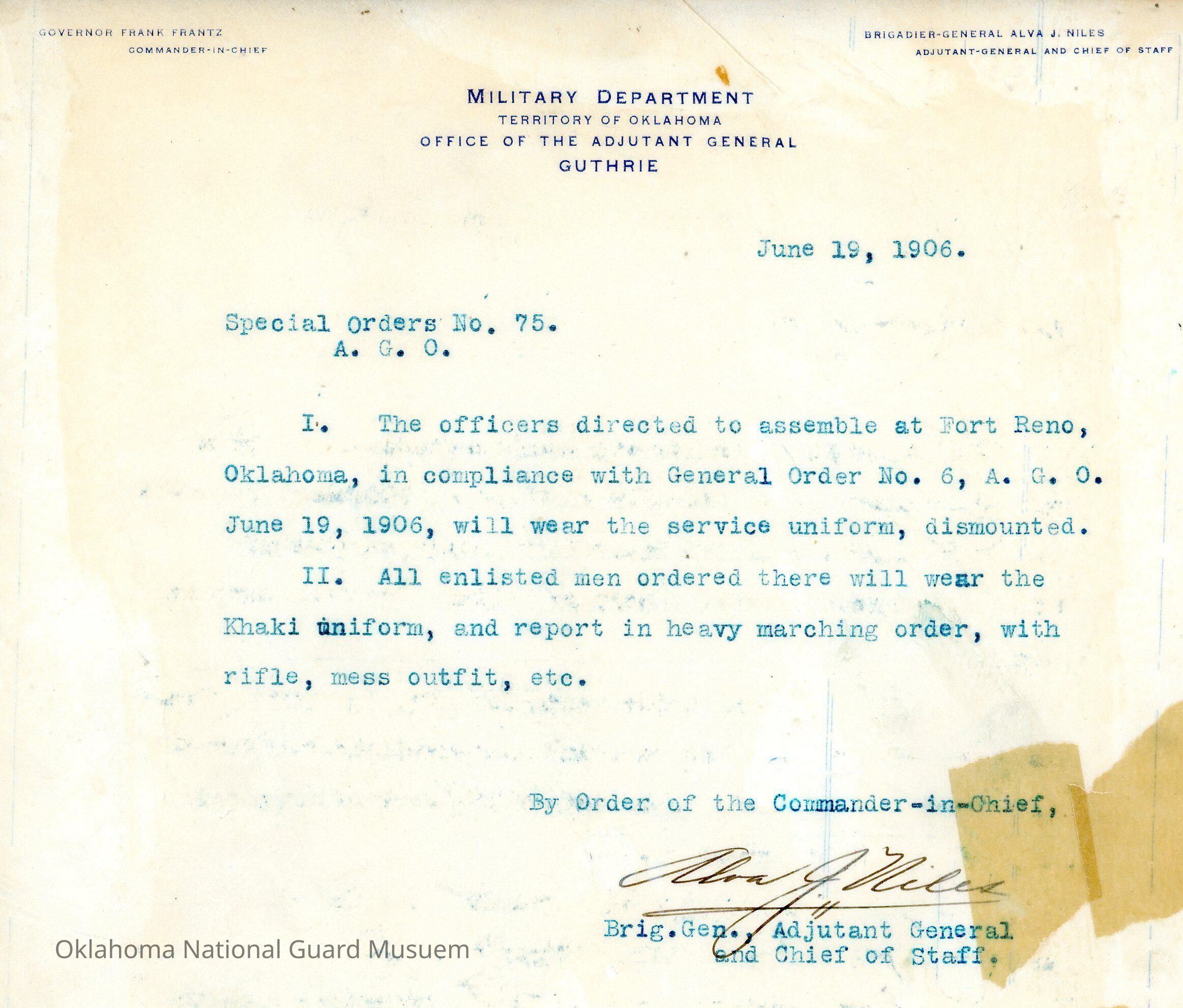 Special Order #75 from Headquarters Adjutant General's Office in Guthrie. The order details the uniform requirements for the soldiers ordered to Fort RenoDate(s) of Creation