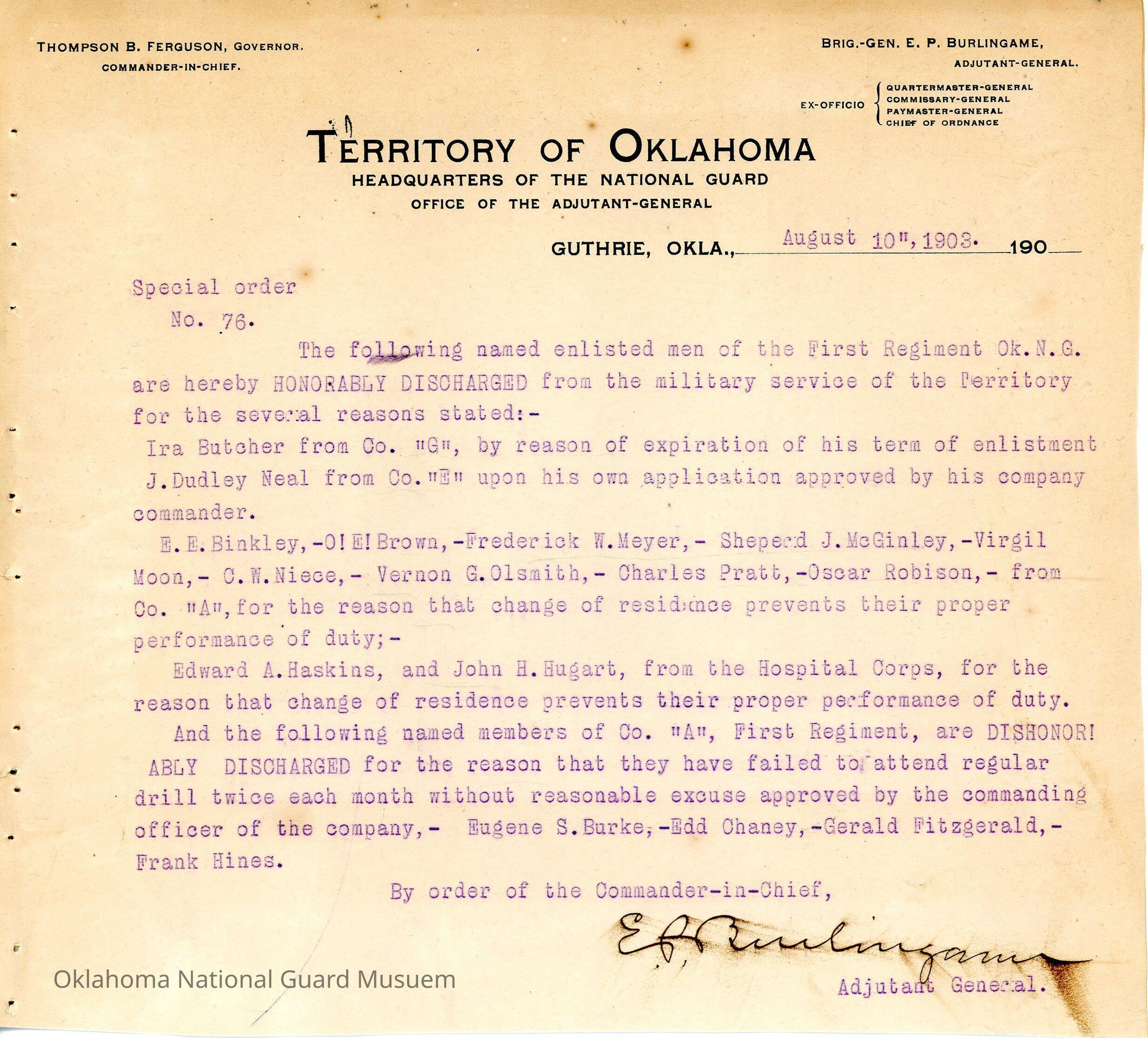 Adjutant General, Guthrie, E.P. Burlingame, Thompson B. Ferguson, Honorable discharge, First Regiment, Ira Butcher, J. Dudley Neal, E.E. Binkley, O.E. Brown, Frederick W. Meyer, Sheprd J. McGinley, Virgil Moon, C.W. Niece, Vernon G. Olsmith, Charles Pratt, Oscar Robison, Edward A. Haskins, John H. Hugart, Hospital Corps, Eugene S. Burke, Edd Chaney, Gerald Fitzgerald, Frank Hines