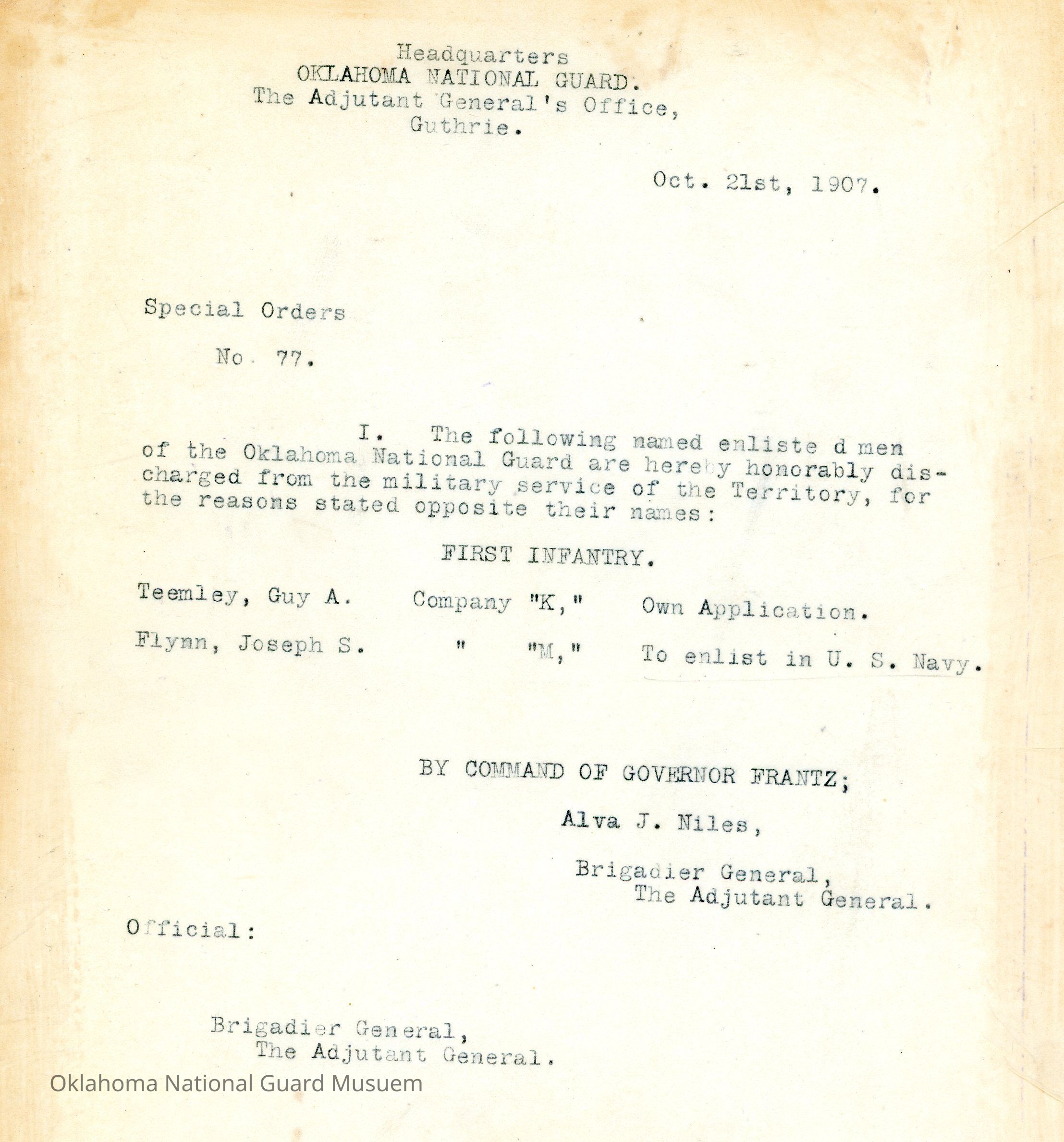 Adjutant General, Guthrie, Alva J. Niles, Honorable discharges, First Infantry, Frank Frantz, Guy A. Teemley, Joseph S. Flynn, Navy