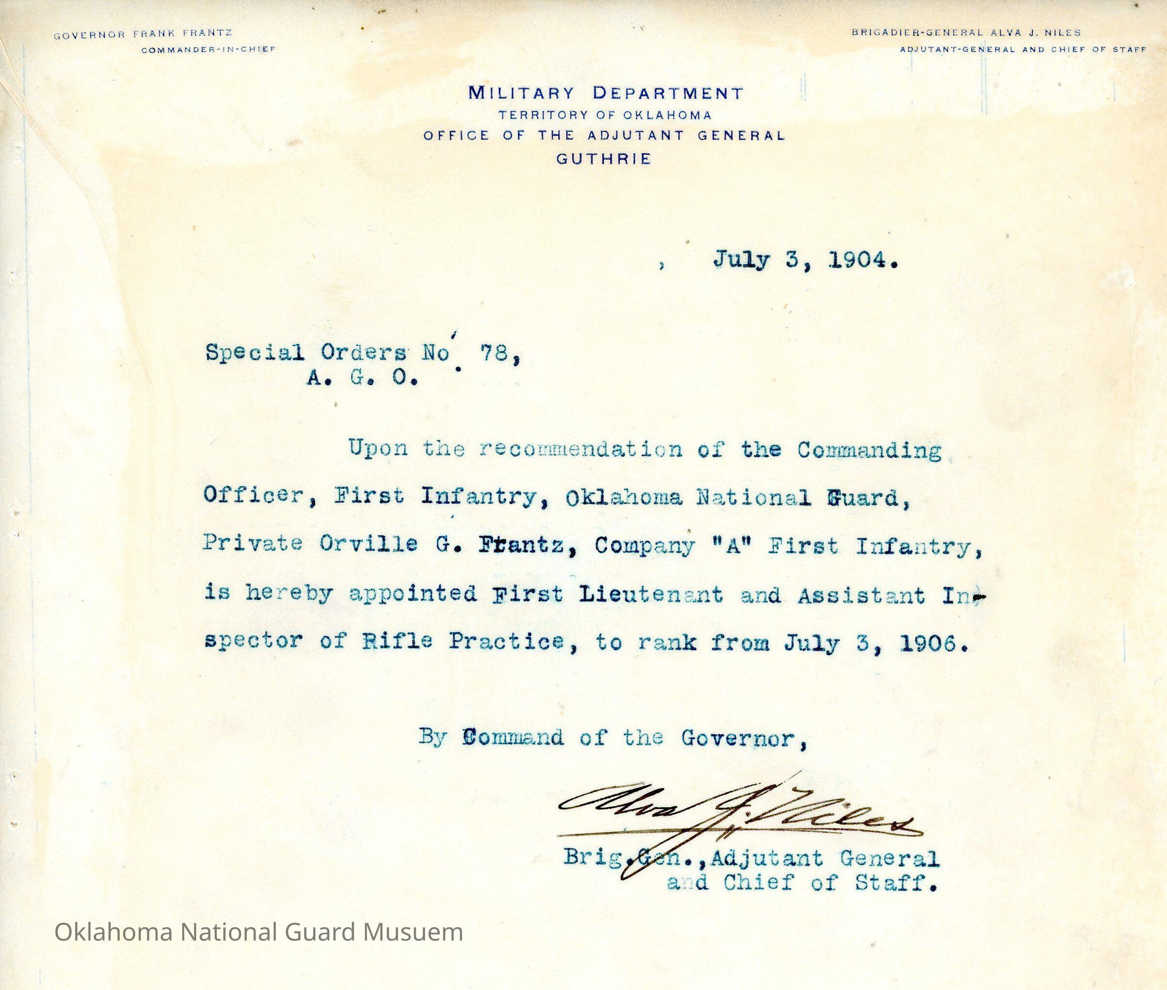 Special Order #77 from Headquarters Adjutant General's Office in Guthrie. The order appoints Orville G. Frantz Inspector of Rifle PracticeDate(s) of Creation