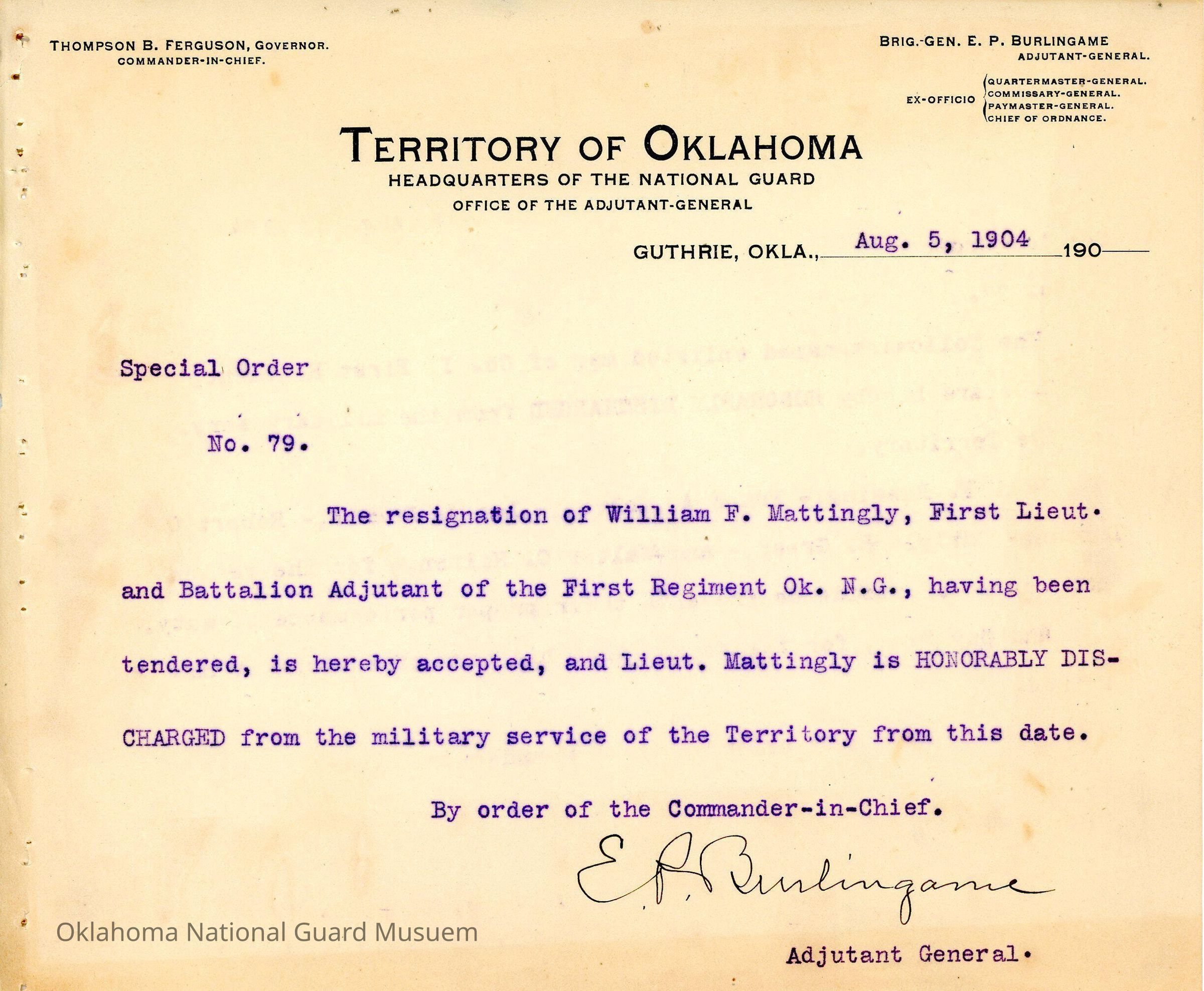 Adjutant General, Guthrie, E.P. Burlingame, Thompson B. Ferguson, First Regiment, Honorable discharges, Resignation, William F. Mattingly