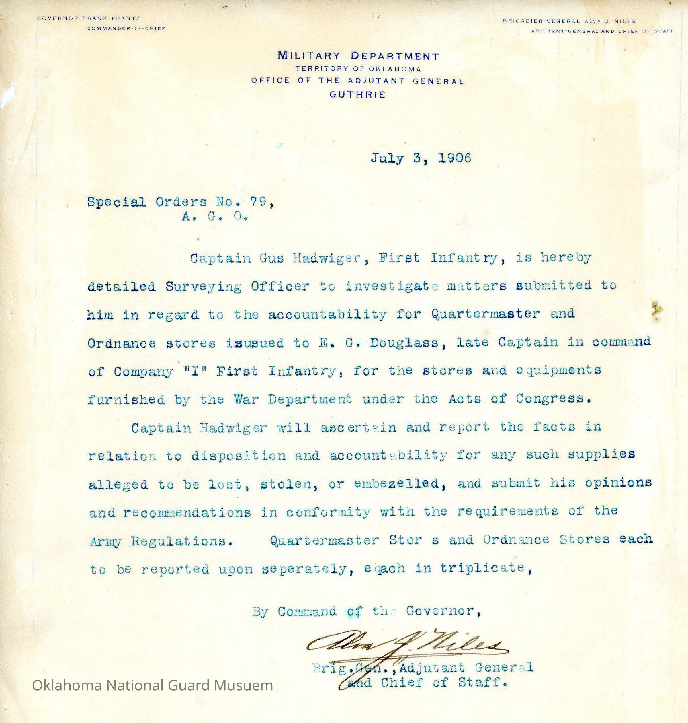 Special Order #79 from Headquarters Adjutant General's Office in Guthrie. The order details Gus Hadwiger to check for lost, stolen, or embezzled property after E.G. Douglass left command of Company I First InfantryDate(s) of Creation