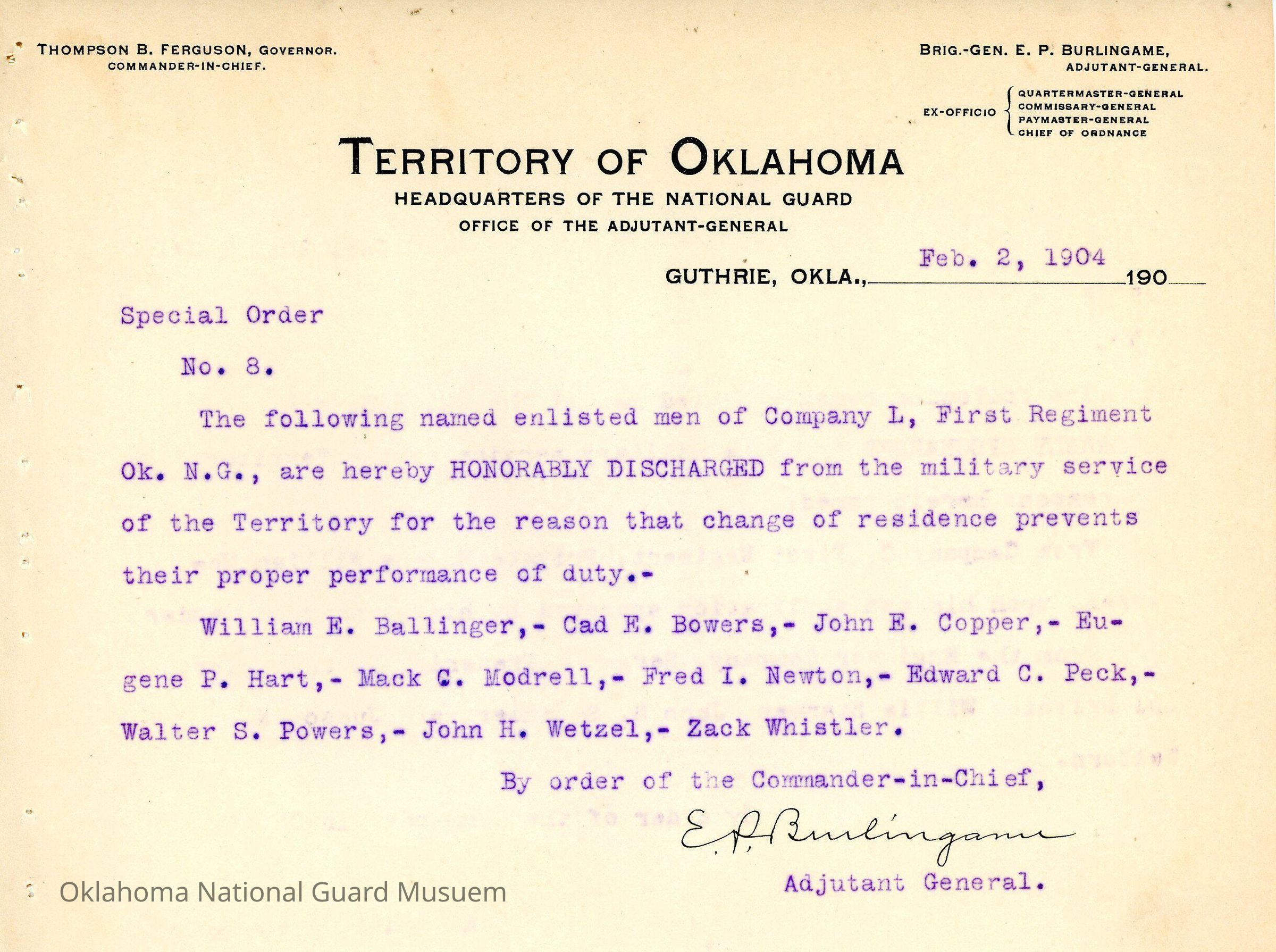 Adjutant General, Guthrie, E.P. Burlingame, Thompson B. Ferguson, First Regiment, Honorable discharges, William E. Ballinger, Cad E. Bowers, John E. Copper, Eugene P. Hart, Mack C. Modrell, Fred I. Newton, Edward C. Peck, Walter S. Powers, John H. Wetzel, Zack Whistler