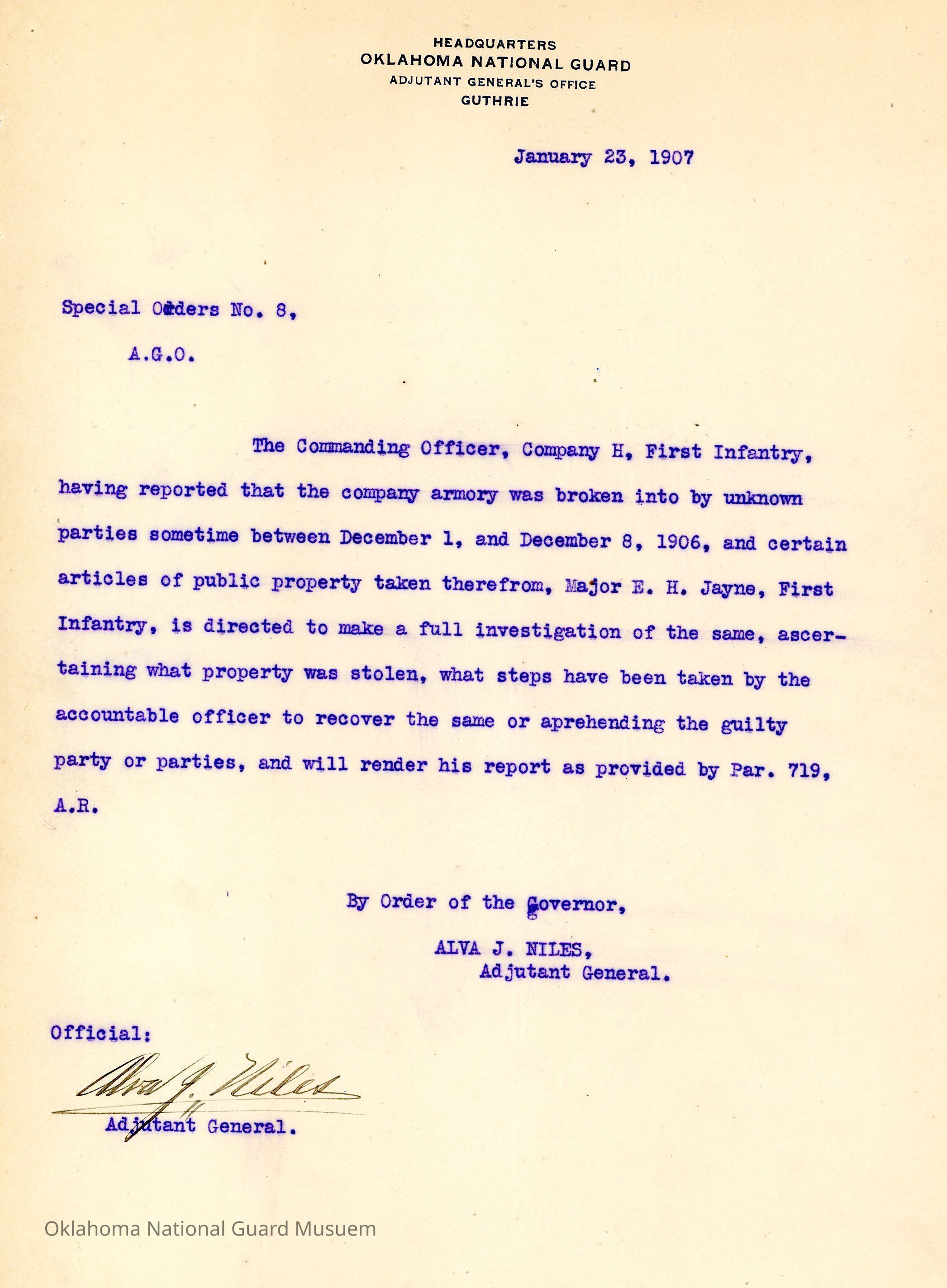 Special Order #8 from Headquarters Adjutant General's Office in Guthrie. The order instructs E.H. Jayne to investigate a break-in and theft of rifles and other property from the armory of Company H First InfantryDate(s) of Creation
