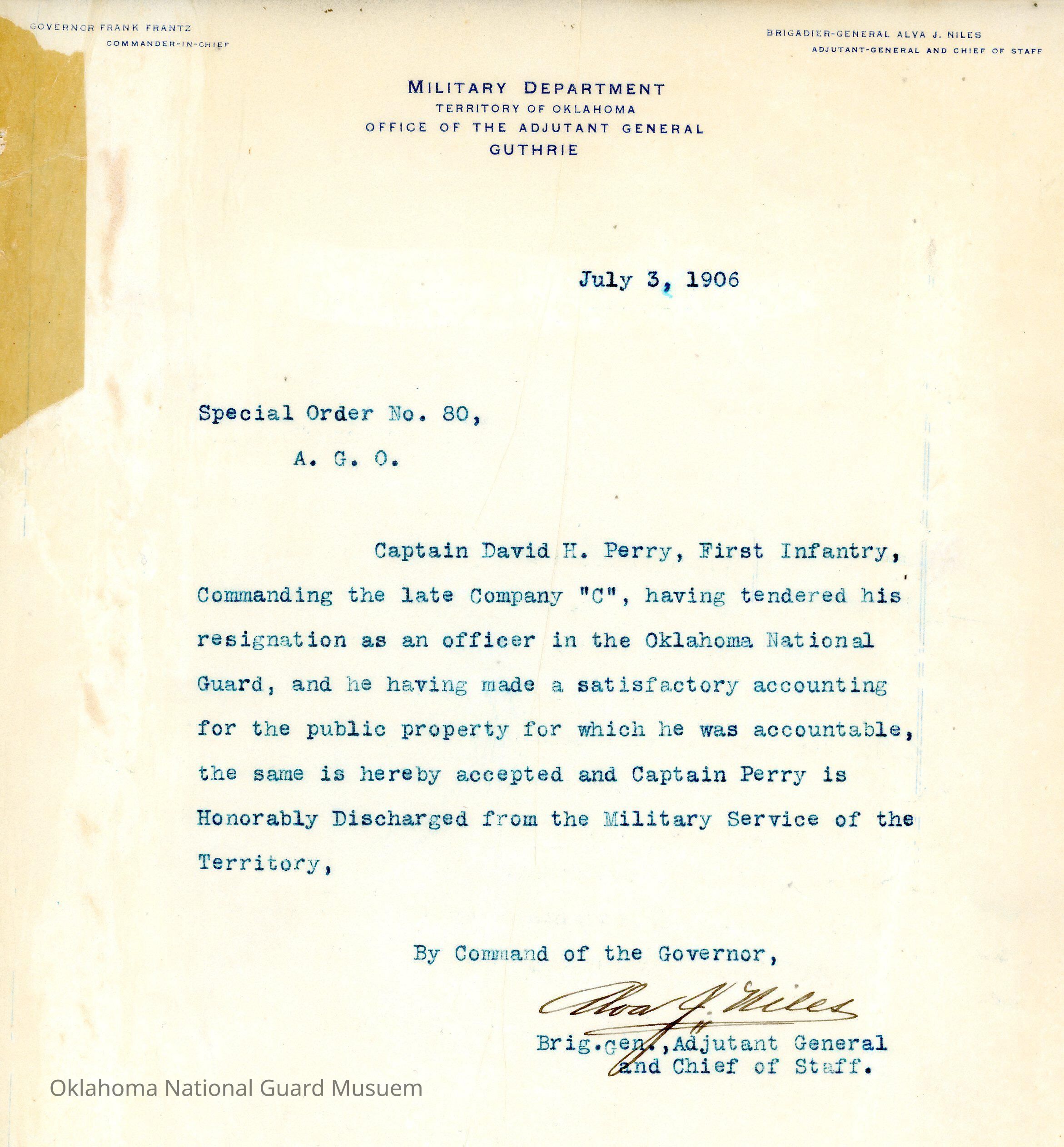 Adjutant General, Guthrie, Frank Frantz, Alva J. Niles, First Infantry, Honorable discharges, David H. Perry