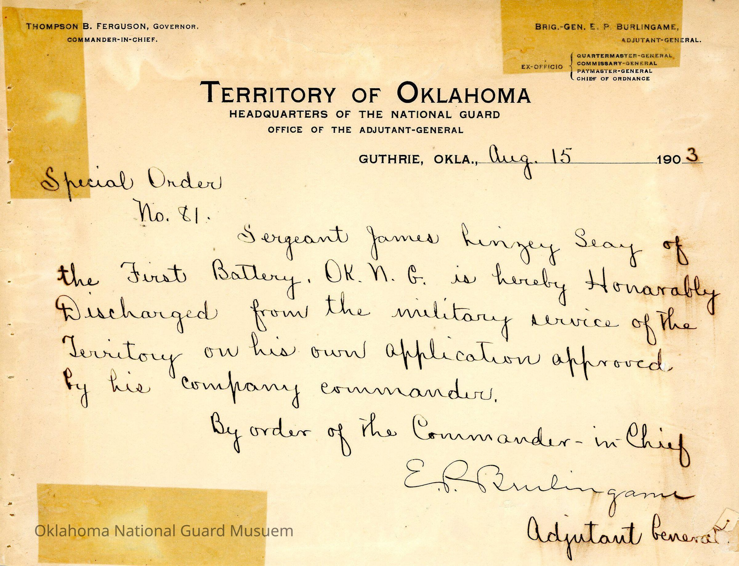 Adjutant General, Guthrie, E.P. Burlingame, Thompson B. Ferguson, Honorable discharge, First Regiment, James Hinzey Seay