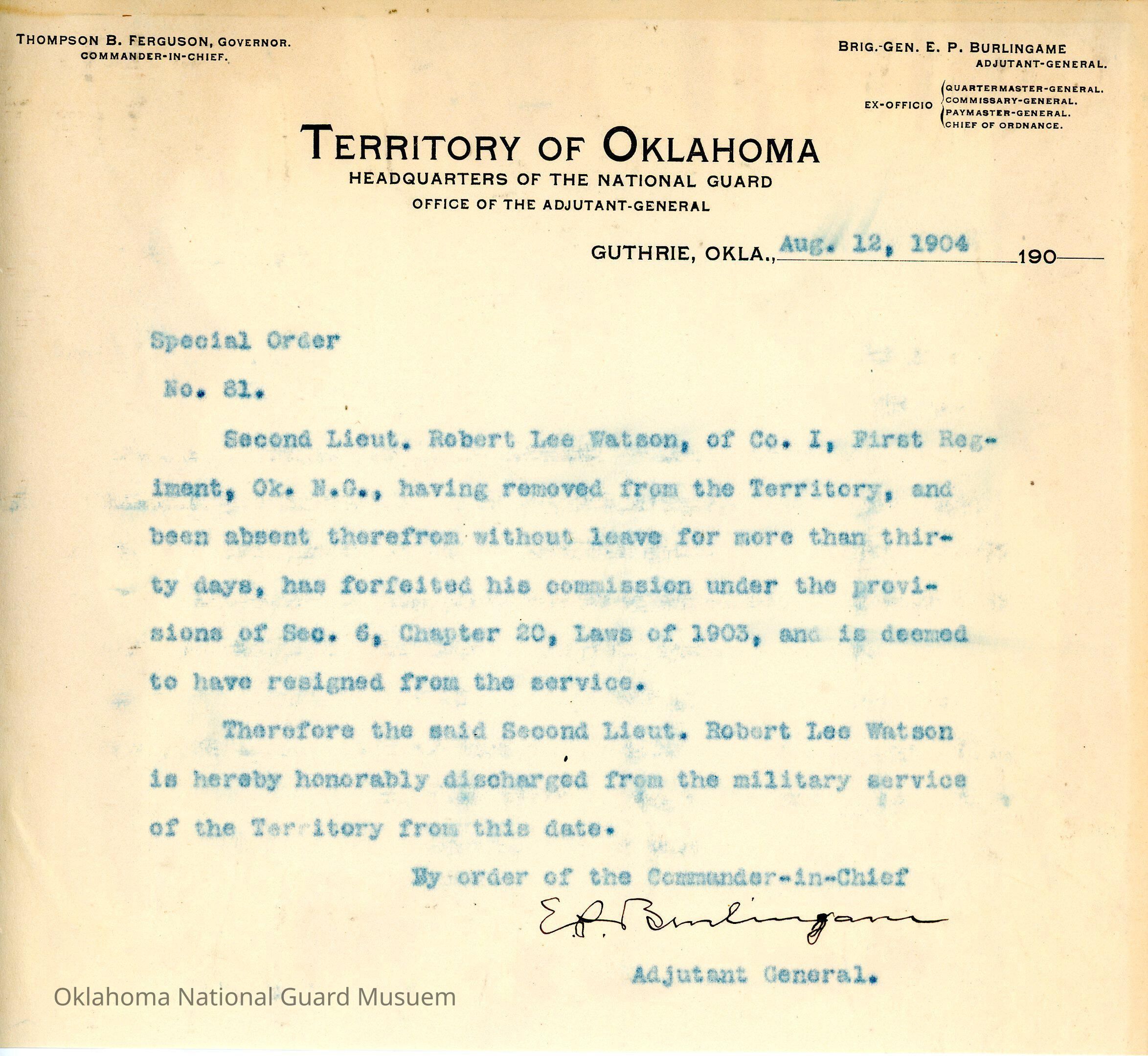 Adjutant General, Guthrie, E.P. Burlingame, Thompson B. Ferguson, First Regiment, Honorable discharges, Robert Lee Watson