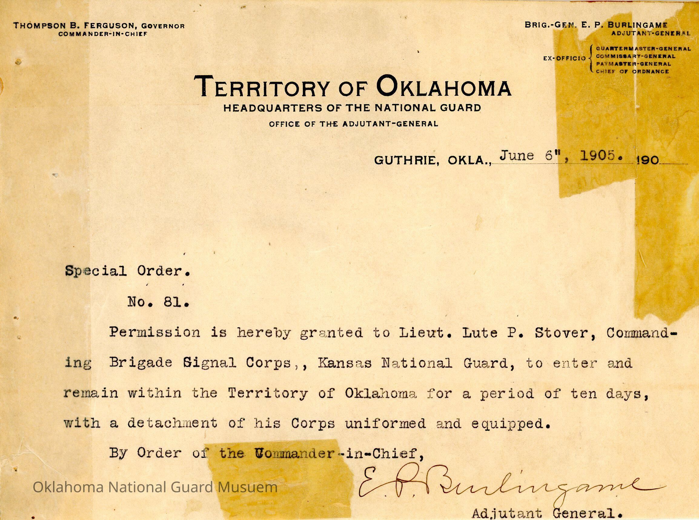 Adjutant General, Guthrie, E.P. Burlingame, Thompson B. Ferguson, Permission, Signal Corps, Kansas National Guard, Lute P. Stover