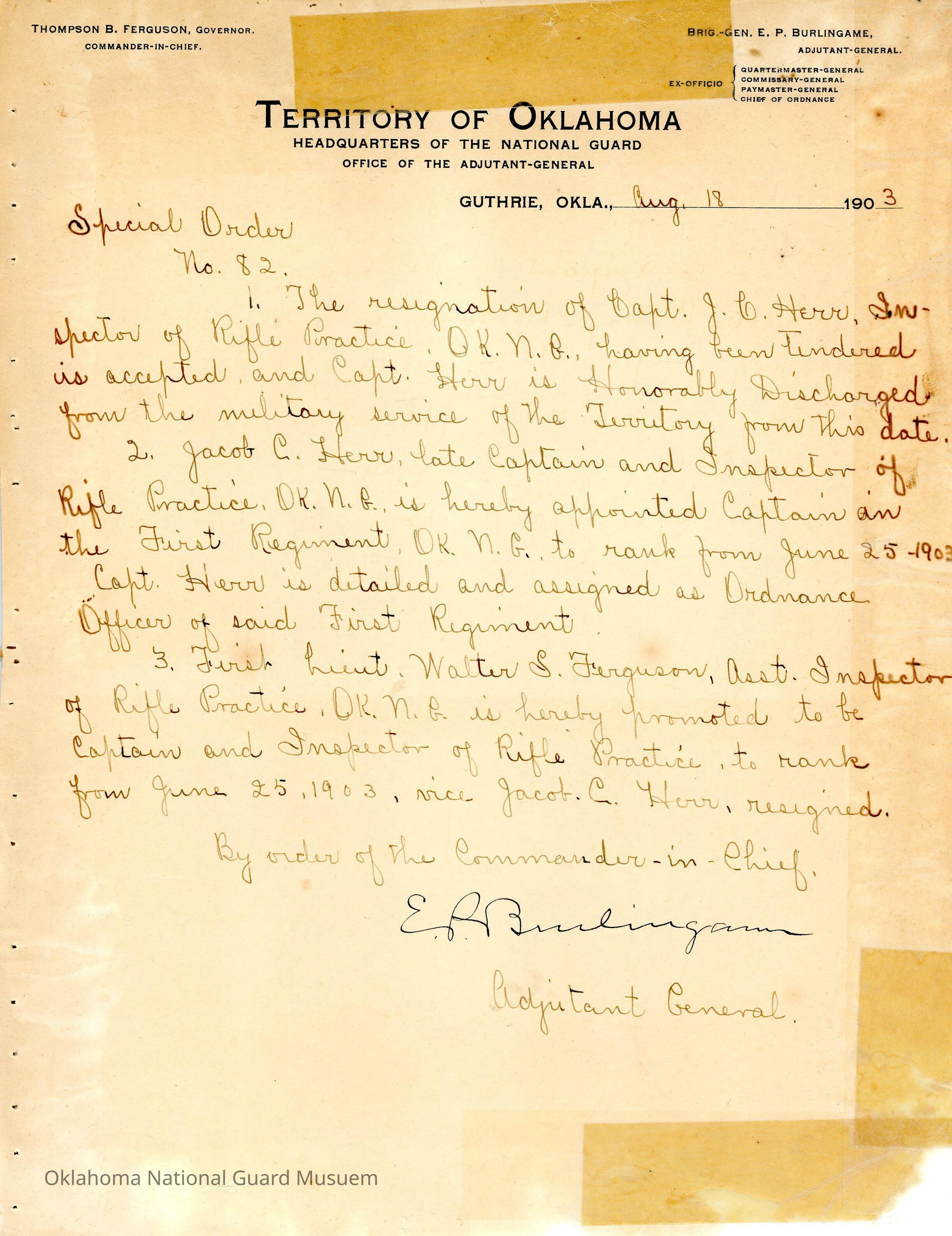 Special Order #82 from Headquarters Adjutant General's Office in Guthrie. The order appoints Jacob C. Herr as Ordinance Officer for the Oklahoma Guard. It also promotes Walter S. Ferguson to Inspector of Rifle Practice. HandwrittenDate(s) of Creation