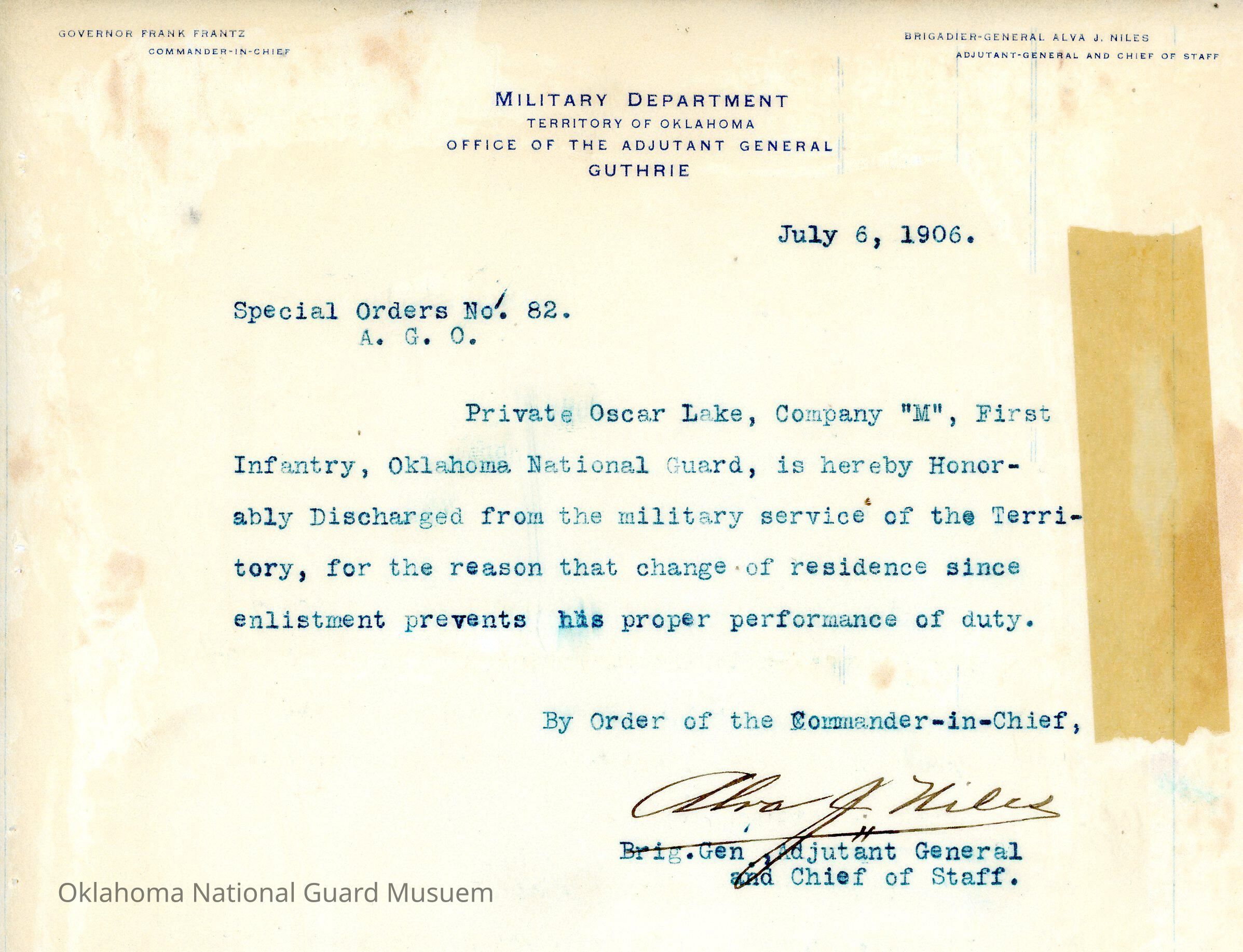 Adjutant General, Guthrie, Frank Frantz, Alva J. Niles, First Infantry, Honorable discharges, Oscar Lake