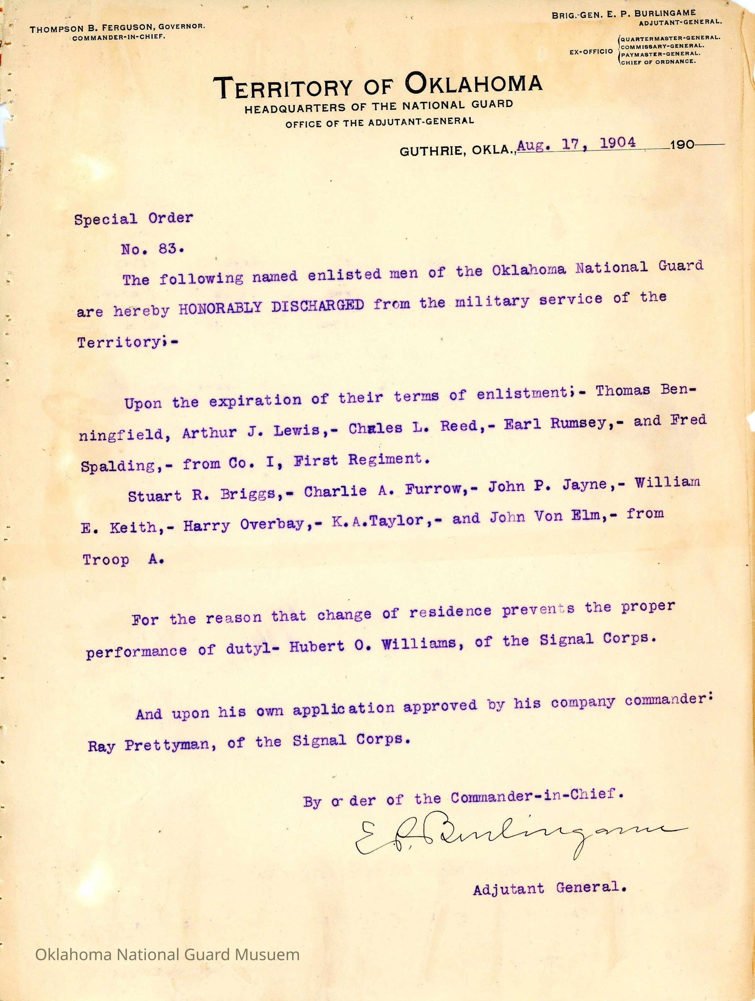 Special Order #83 from Headquarters Adjutant General's Office in Guthrie. The order notes the honorable discharges in the First Regiment and Signal CorpsDate(s) of Creation