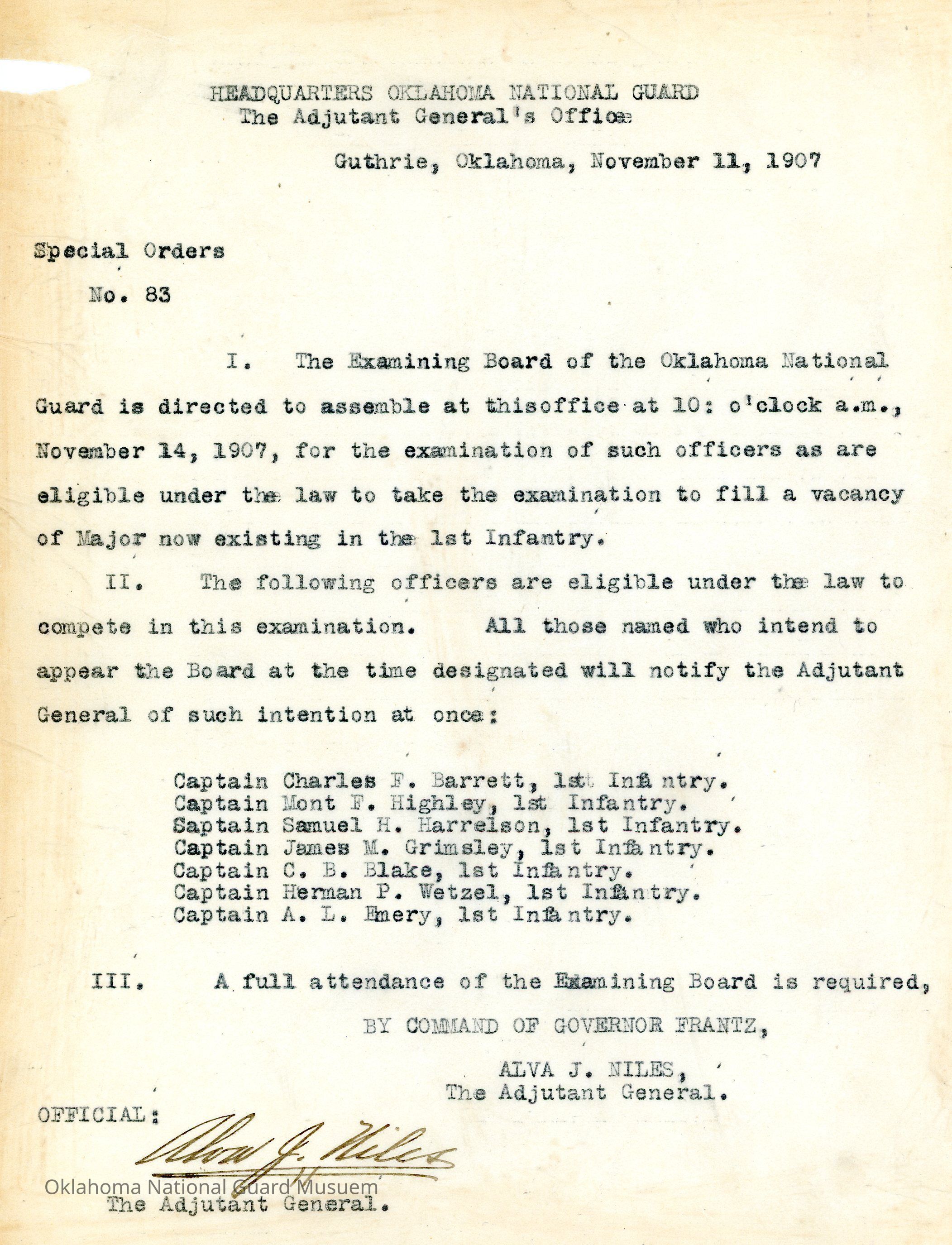 Special Order #83 from Headquarters Adjutant General's Office in Guthrie. The order directs the Examining Board to meet at the office of the Adjutant General to fill a vacancy of Major in the First InfantryDate(s) of Creation