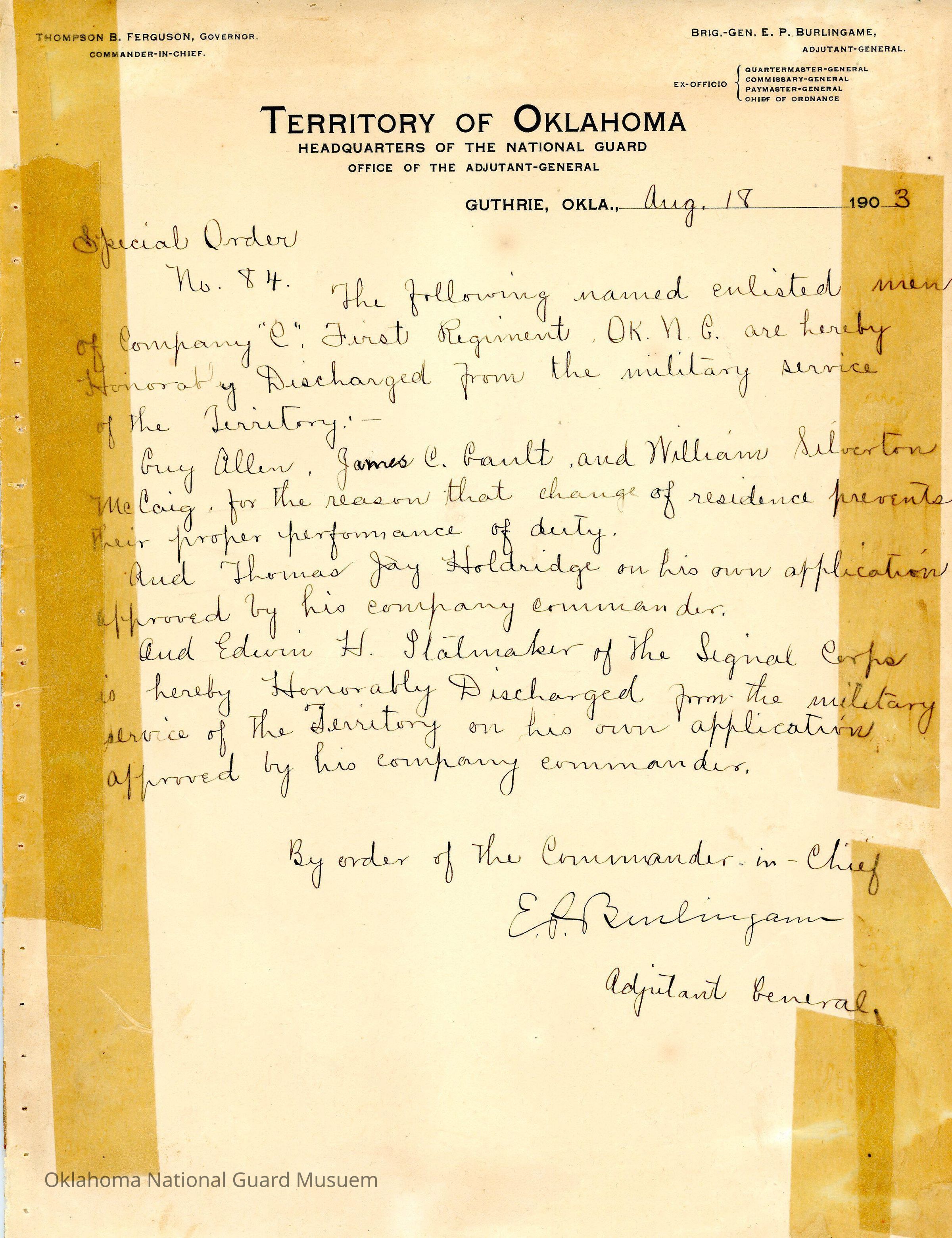 Adjutant General, Guthrie, E.P. Burlingame, Thompson B. Ferguson, Honorable discharge, First Regiment, Guy Allen, James C. Gault, William Silverton McCaig, Thomas Jay Holdridge, Edwin H Stalnacker, Signal Corps