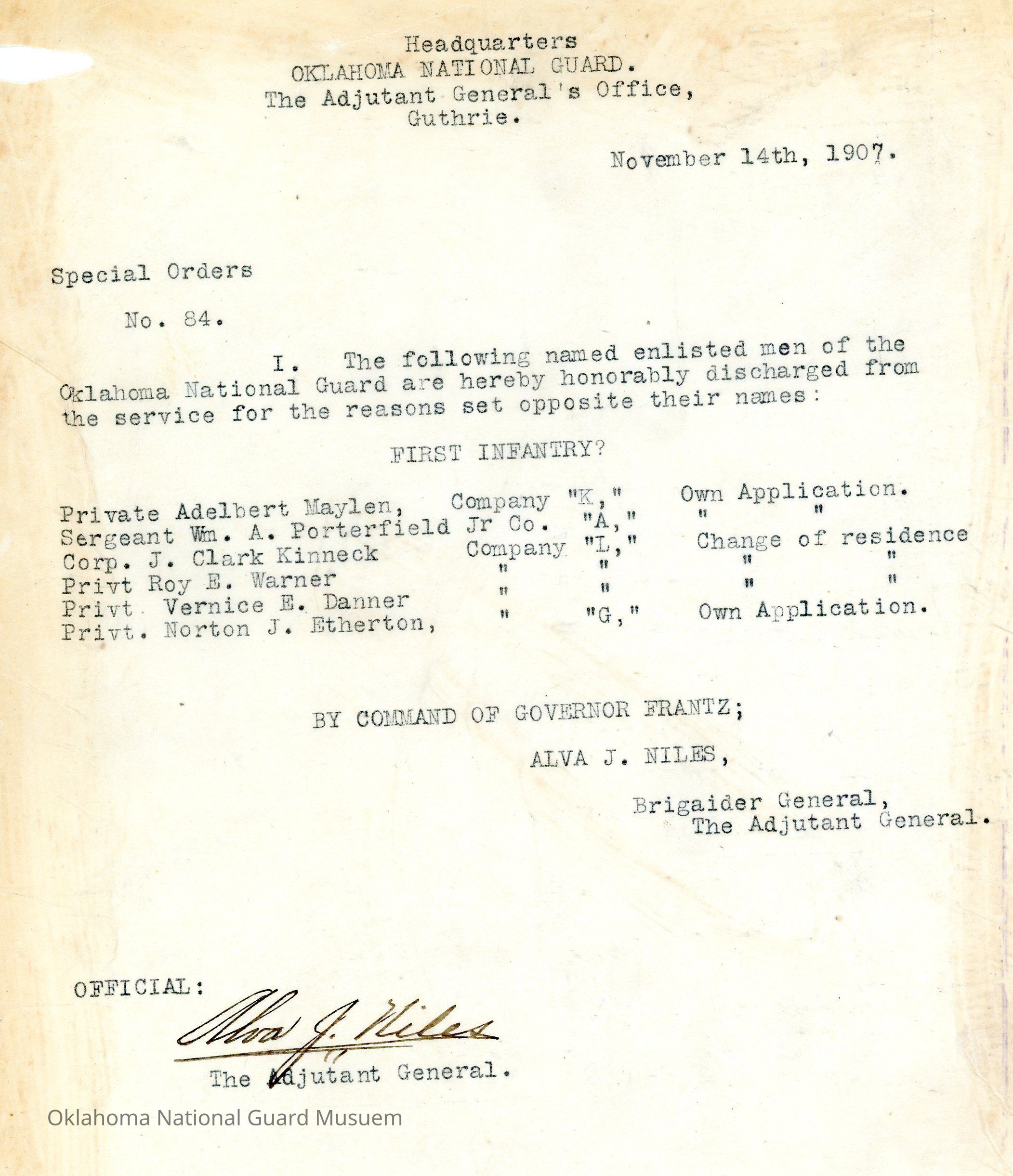 Adjutant General, Guthrie, Alva J. Niles, Honorable discharges, First Infantry, Frank Frantz, Adelbert Maylen, William A. Porterfield Jr, J. Clark Kinneck, Roy E. Warner, Vernice E. Danner, Norton J. Etherton