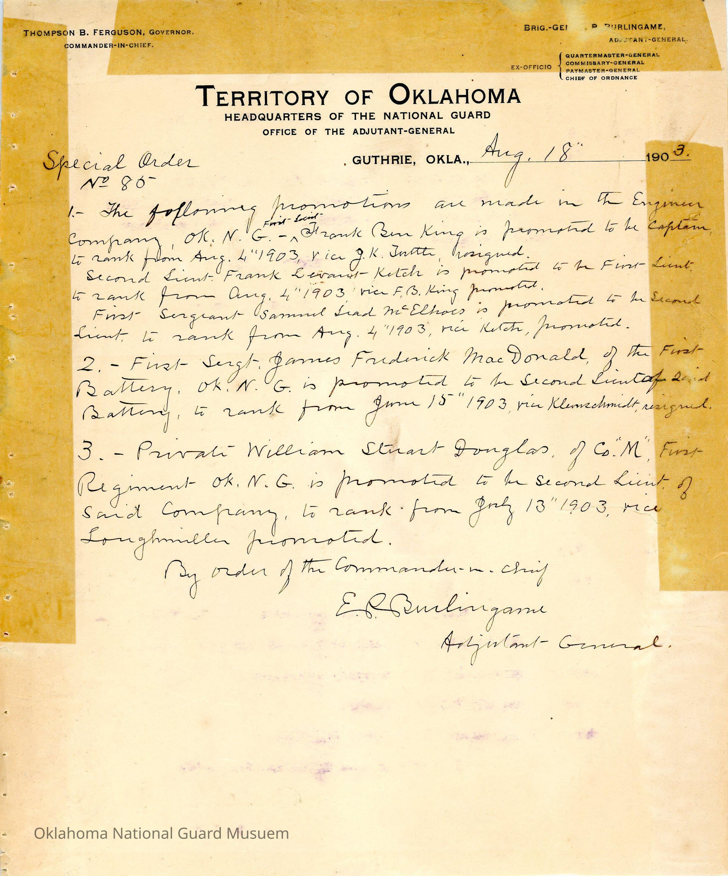 Adjutant General, Guthrie, E.P. Burlingame, Thompson B. Ferguson, Promotion, First Regiment, Frank Bin King, Fredrick MacDonald, First Battery, William Douglas