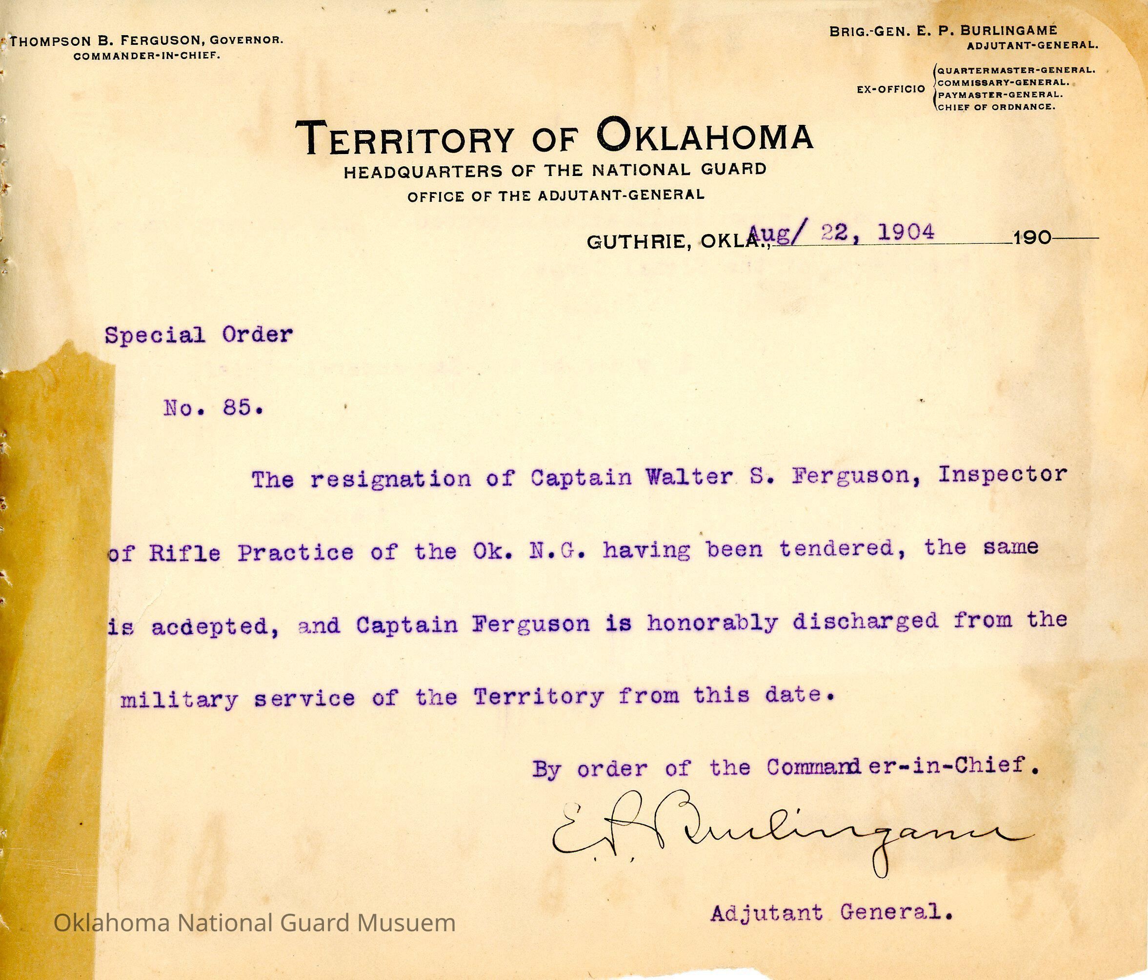 Adjutant General, Guthrie, E.P. Burlingame, Thompson B. Ferguson, First Regiment, Honorable discharges, Resignation, Walter S. Ferguson