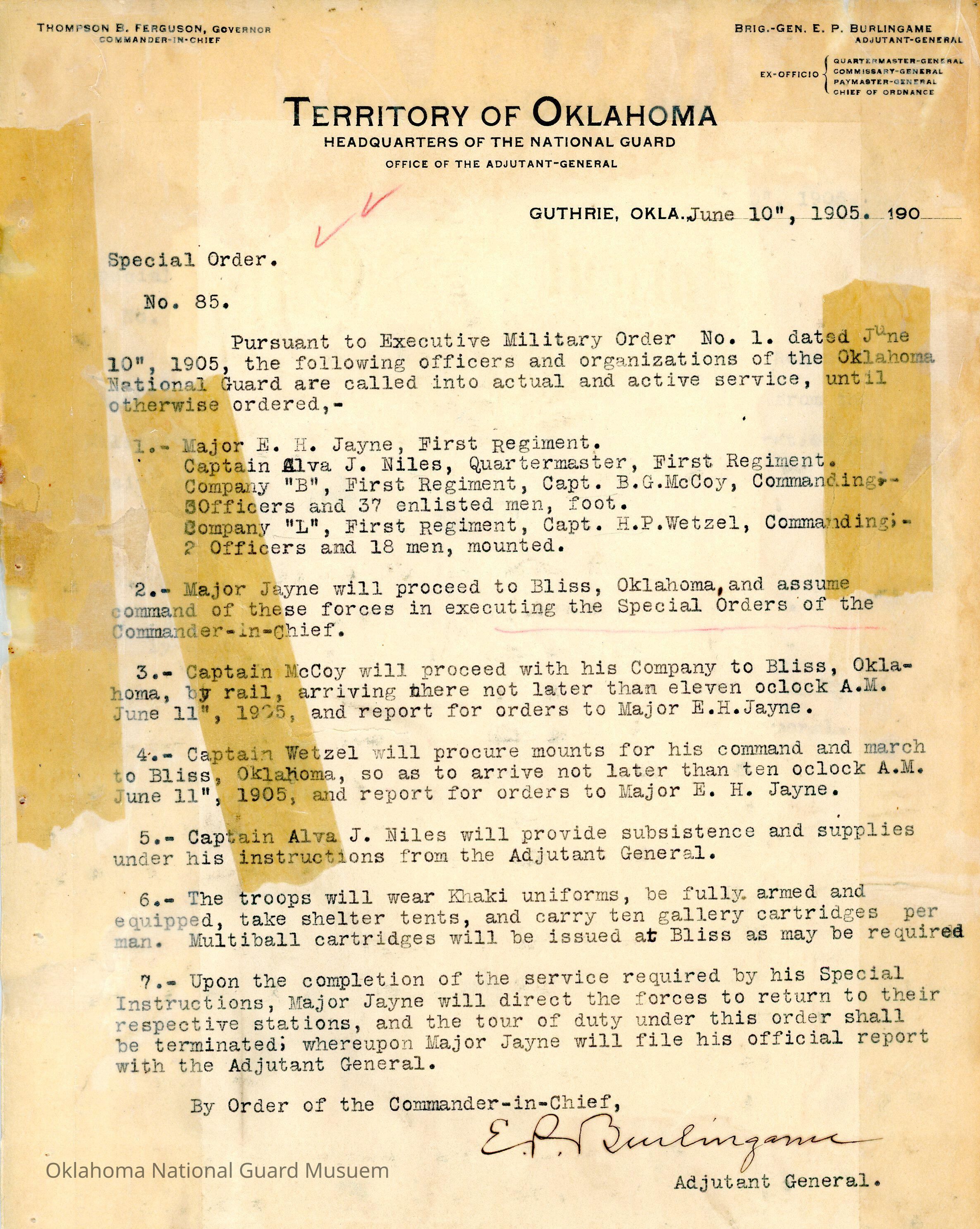 Special Order #85 from Headquarters Adjutant General's Office in Guthrie. The order places two companies of Oklahoma National Guard troops on active duty and sent to Bliss to carry out the orders in Executive Military Order #1 1905.Date(s) of Creation