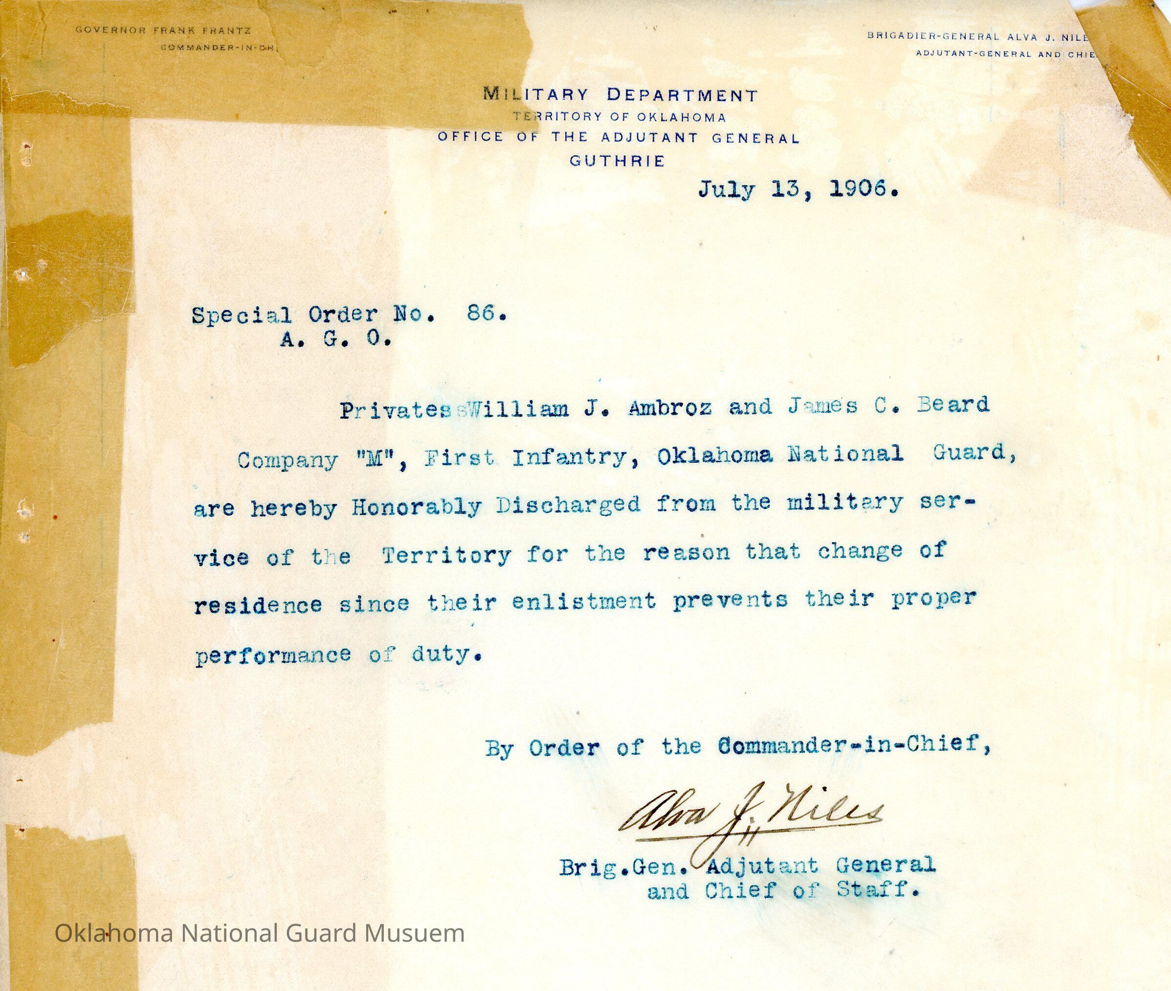 Adjutant General, Guthrie, Frank Frantz, Alva J. Niles, First Infantry, Honorable discharges, William J. Ambroz, James C. Beard