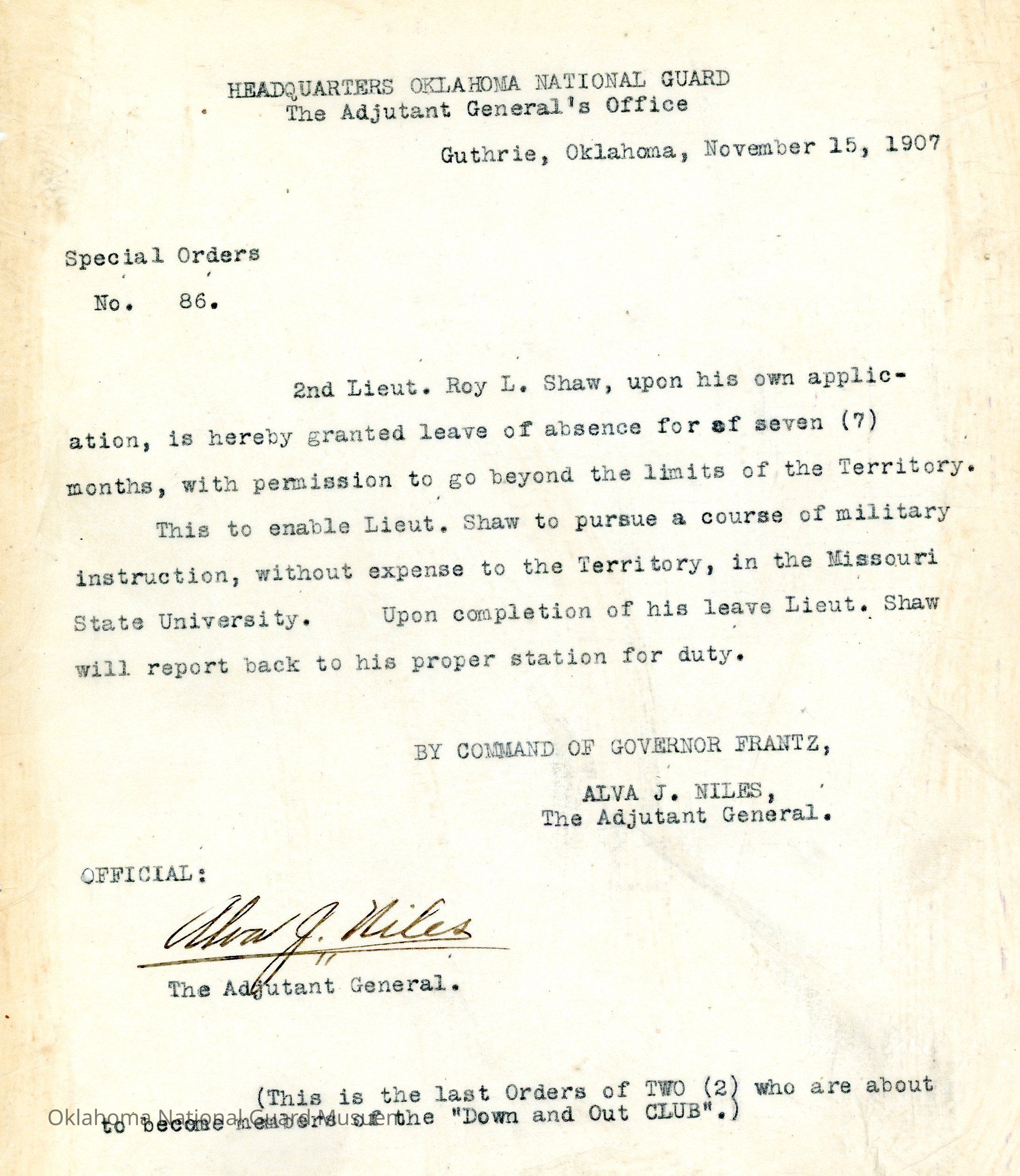 Special Order #86 from Headquarters Adjutant General's Office in Guthrie. The order grants a leave of absence to Roy L. Shaw to attend a course in military instruction at Missouri State UniversityDate(s) of Creation