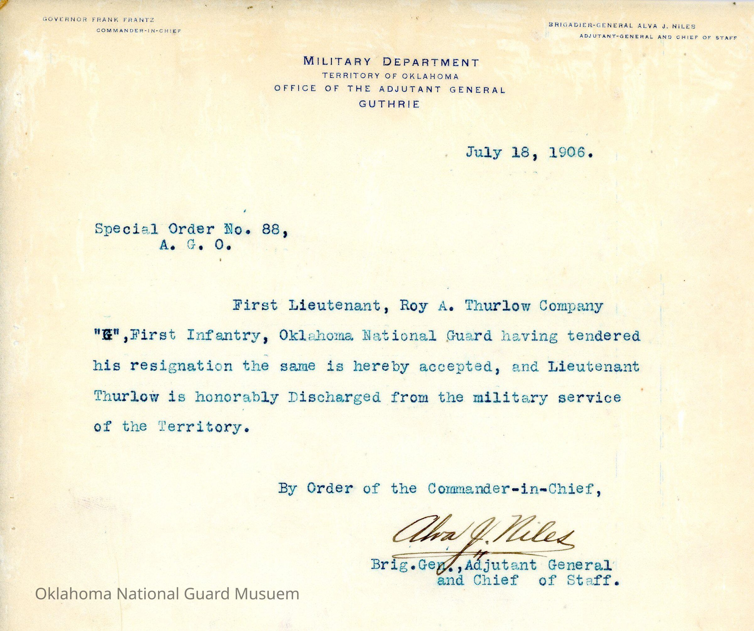 Adjutant General, Guthrie, Frank Frantz, Alva J. Niles, First Infantry, Honorable discharges, Roy A. Thurlow