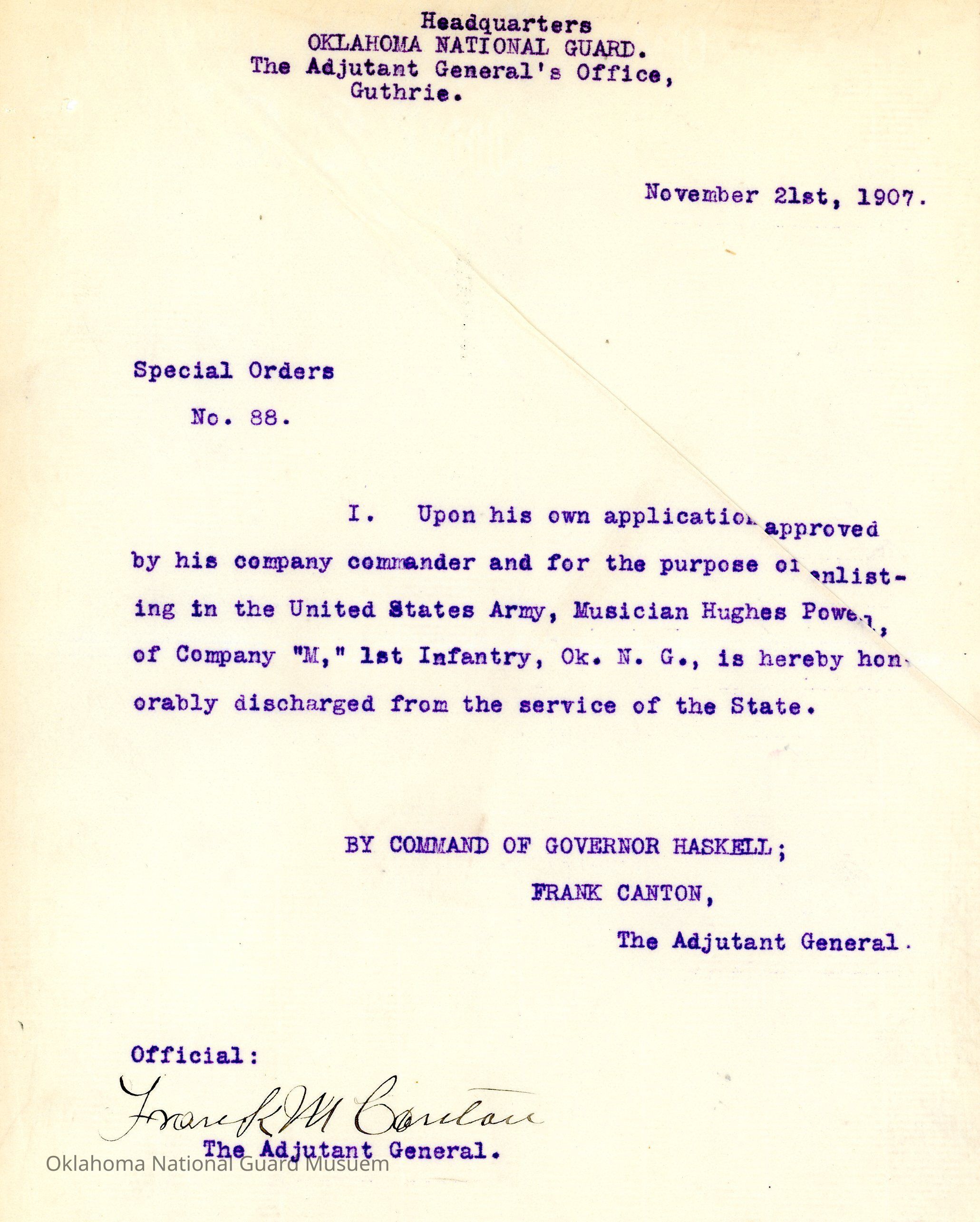 Adjutant General, Guthrie, Frank Canton, Honorable discharges, First Infantry, Charles N. Haskell, Hughes Powell, Army, Musician