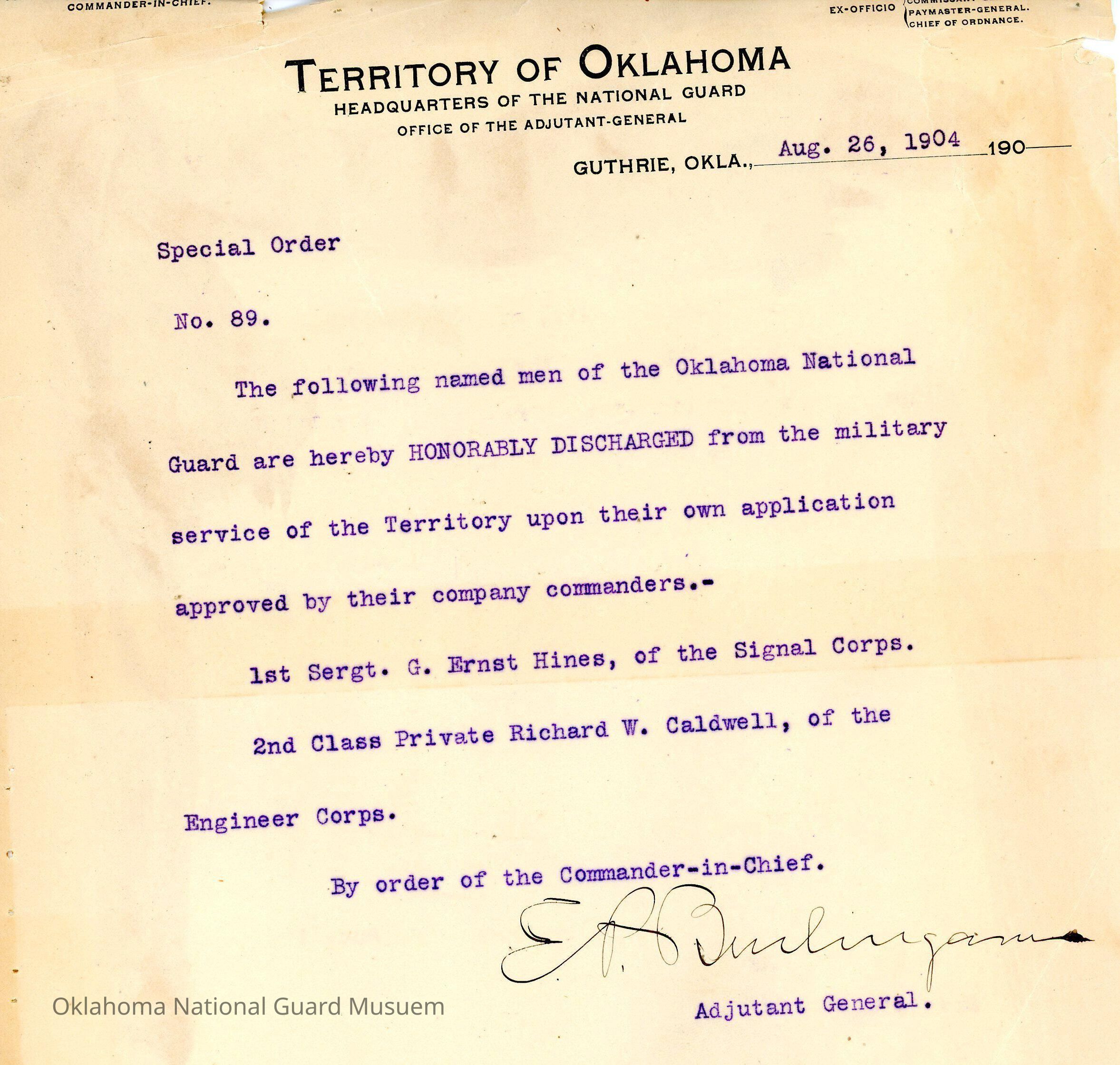 Adjutant General, Guthrie, E.P. Burlingame, Thompson B. Ferguson, First Regiment, Honorable discharges, G. Ernst Hines, Richard W. Caldwell, Signal Corps, Engineer Corps