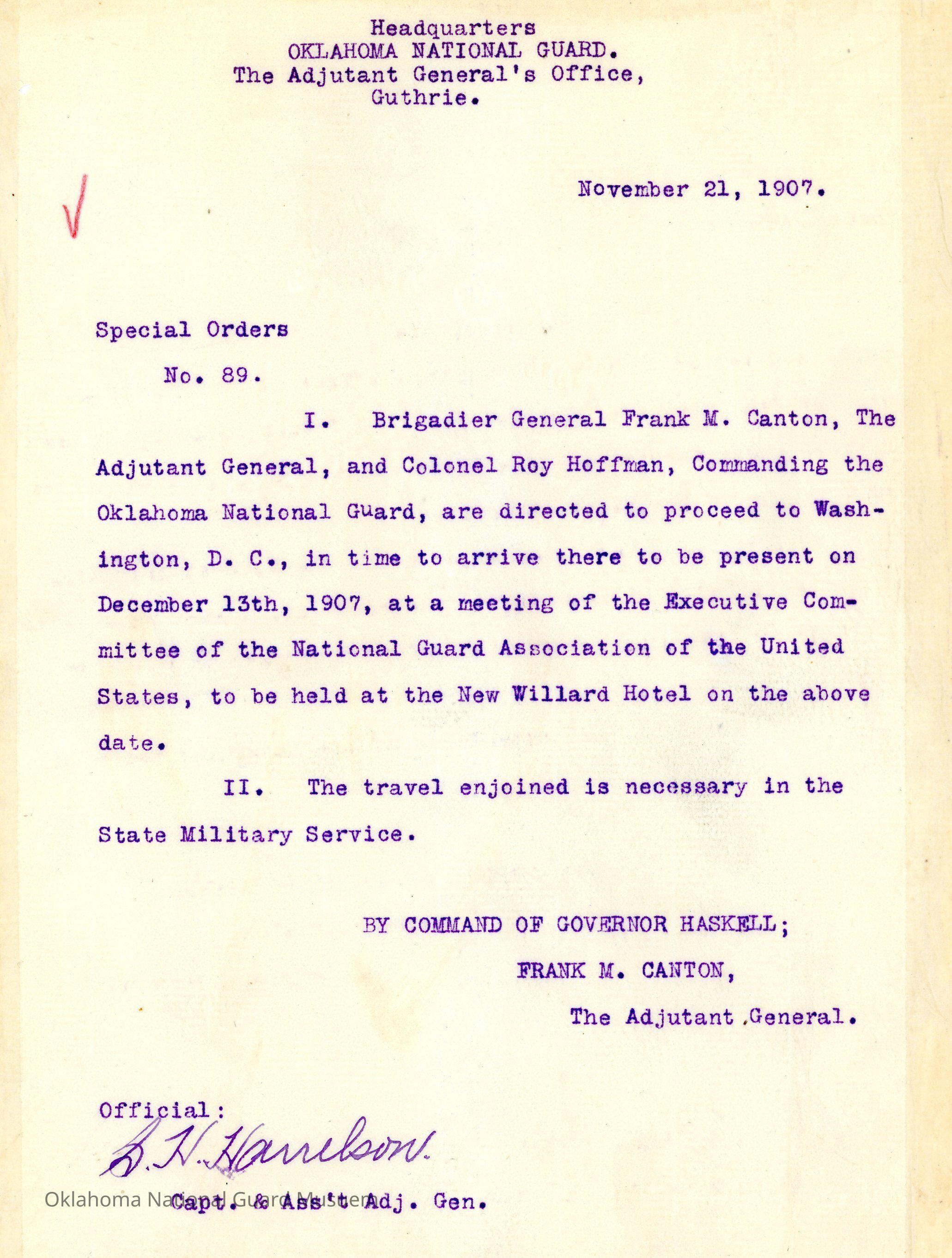 Special Order #89 from Headquarters Adjutant General's Office in Guthrie. The order instructs Frank Canton and Roy Hoffman to attend the meeting of the Executive Committee of the National Guard Association of the United States at the Willard Hotel in Washington DCDate(s) of Creation