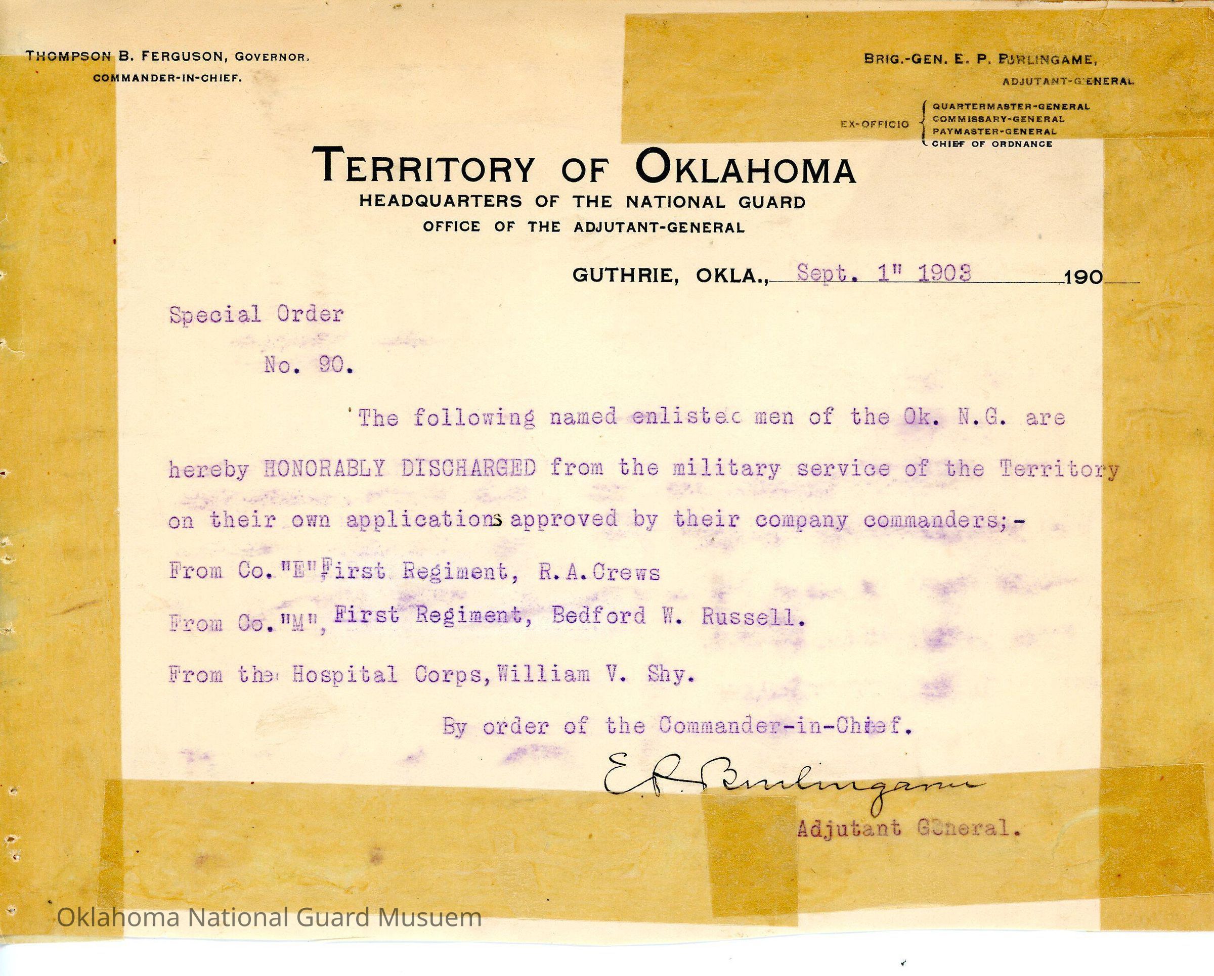 Special Order #90 from Headquarters Adjutant General's Office in Guthrie. The order lists the men who are honorably discharged from First Regiment.Date(s) of Creation