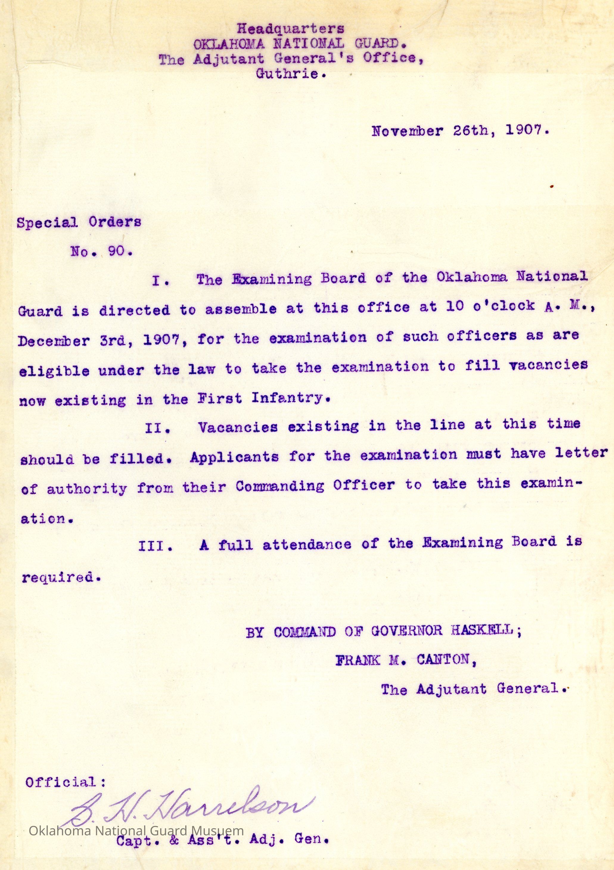 Special Order #90 from Headquarters Adjutant General's Office in Guthrie. The order instructs the Examining Board to meet at the office of the Adjutant General to fill vacancies existing in the First InfantryDate(s) of Creation