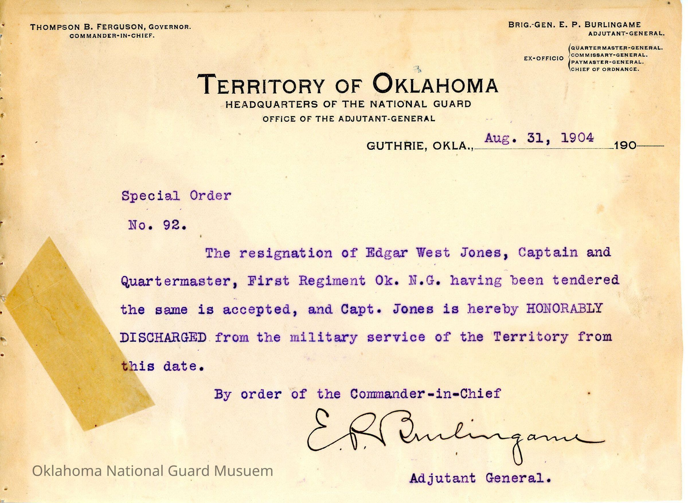 Adjutant General, Guthrie, E.P. Burlingame, Thompson B. Ferguson, First Regiment, Honorable discharges, Resignation, Edgar West Jones