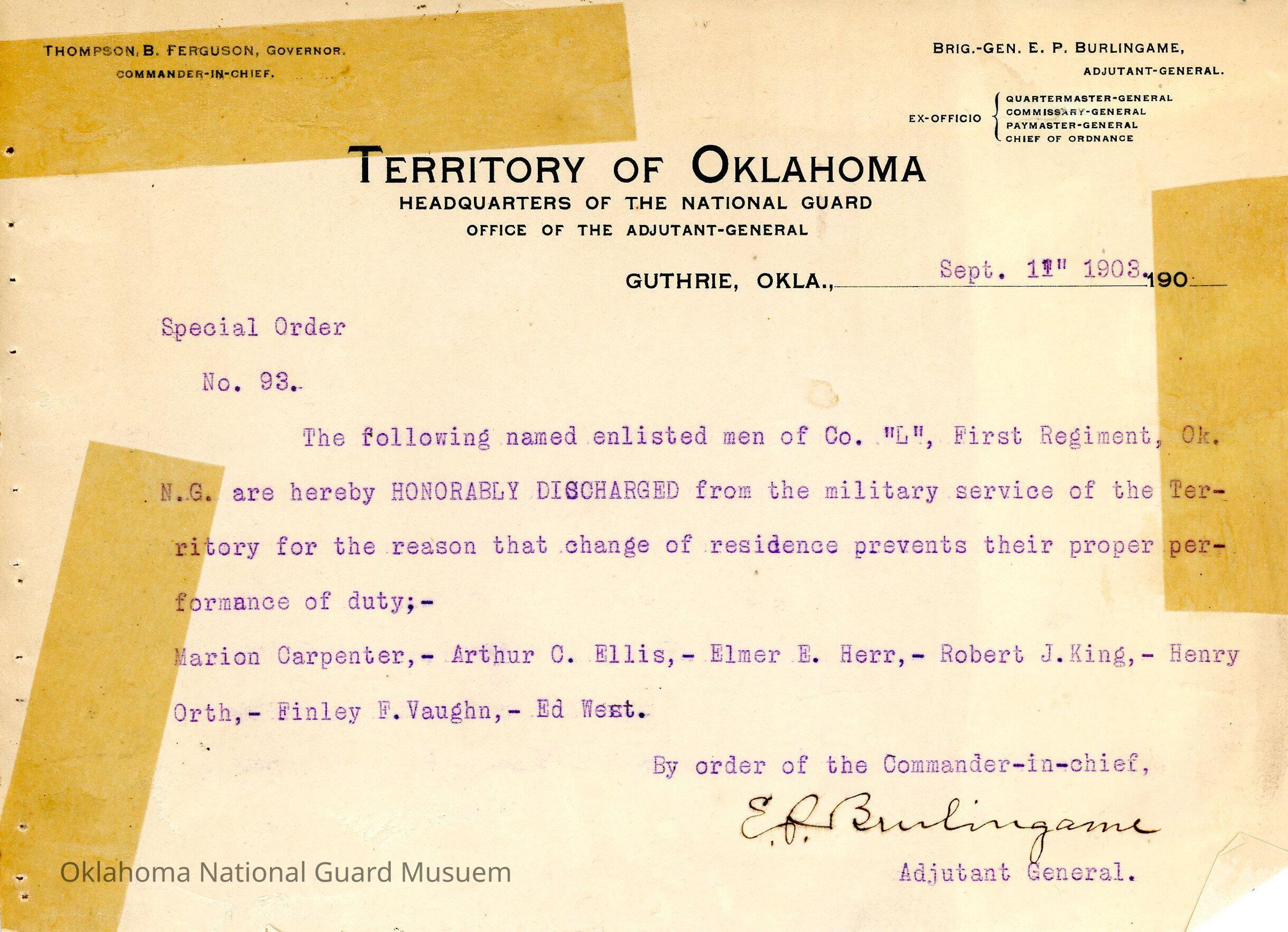 Adjutant General, Guthrie, E.P. Burlingame, Thompson B. Ferguson, Honorable discharge, First Regiment, Marion Carpenter, Arthur C. Ellis, Elmer E. Herr, Robert J. King, Henry Orth, Finley F. Vaughn, Ed West