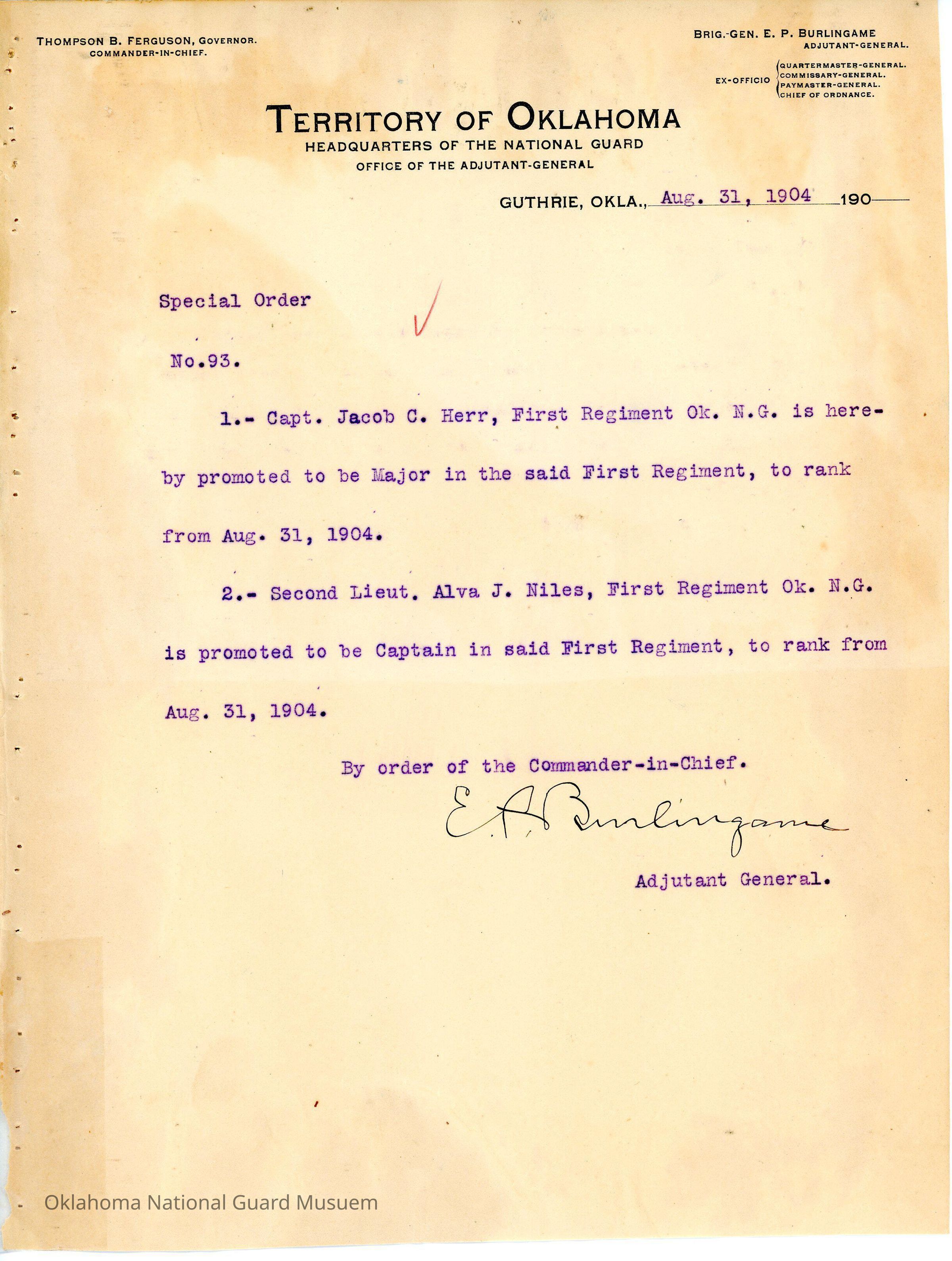 Adjutant General, Guthrie, E.P. Burlingame, Thompson B. Ferguson, First Regiment, Promotions, Jacob C. Herr, Alva J. Niles