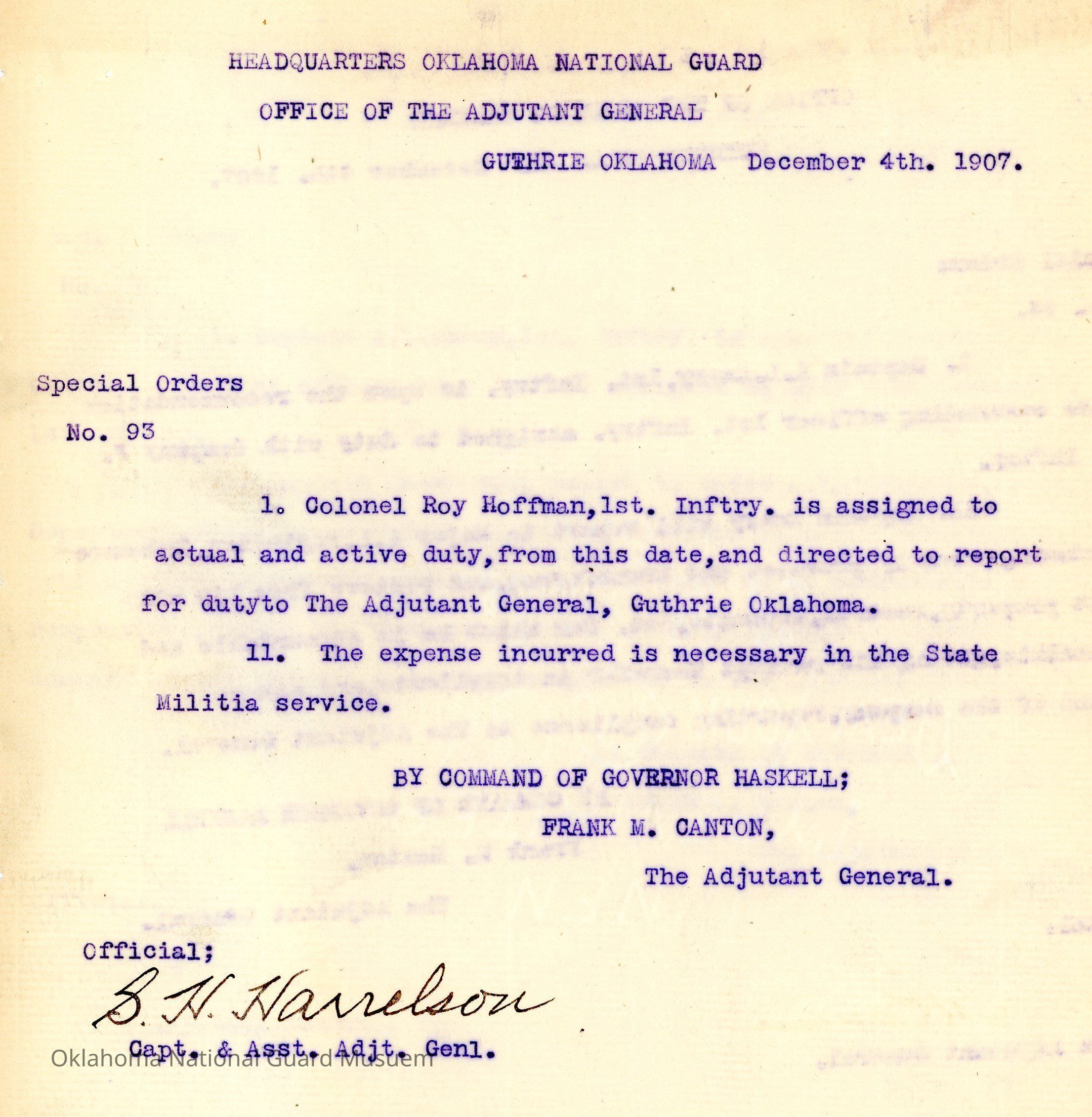 Special Order #93 from Headquarters Adjutant General's Office in Guthrie. The order instructs Roy Hoffman to report for active duty to the Adjutant GeneralDate(s) of Creation
