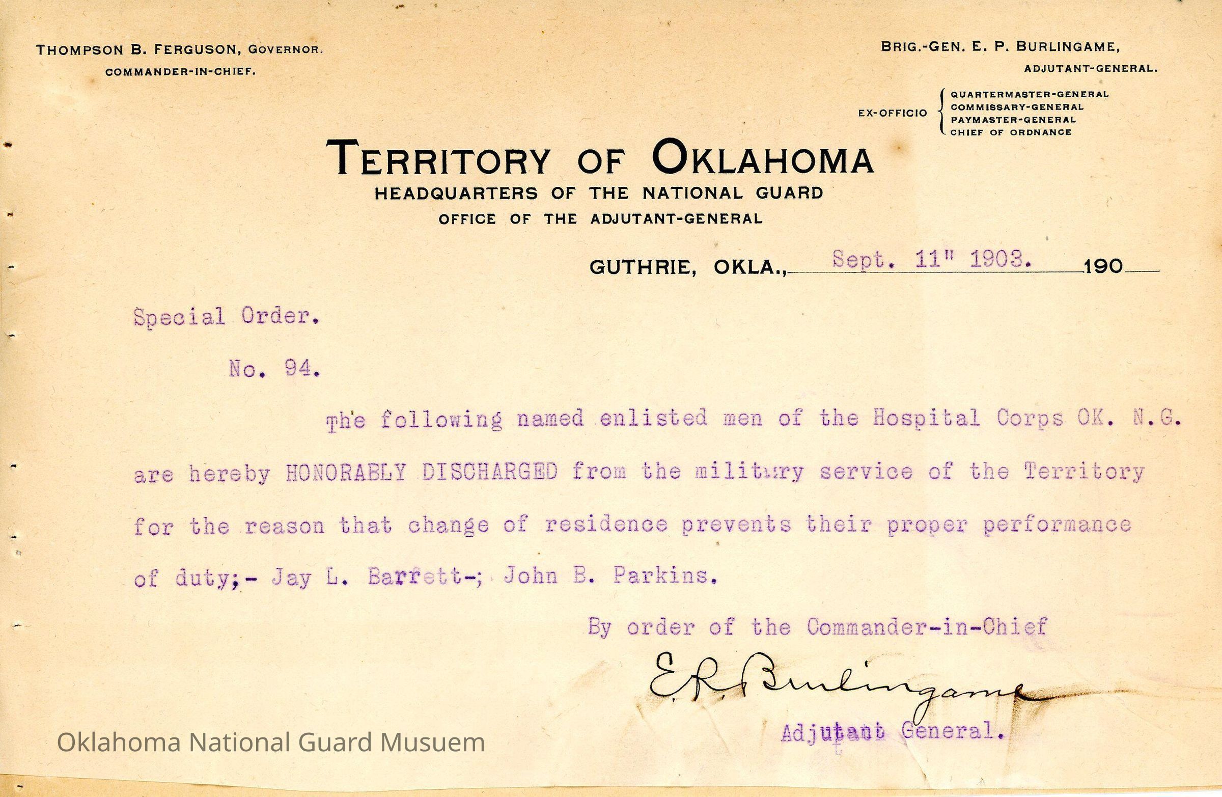 Adjutant General, Guthrie, E.P. Burlingame, Thompson B. Ferguson, Honorable discharge, Hospital Corps, Jay L. Barrett, John B. Parkins