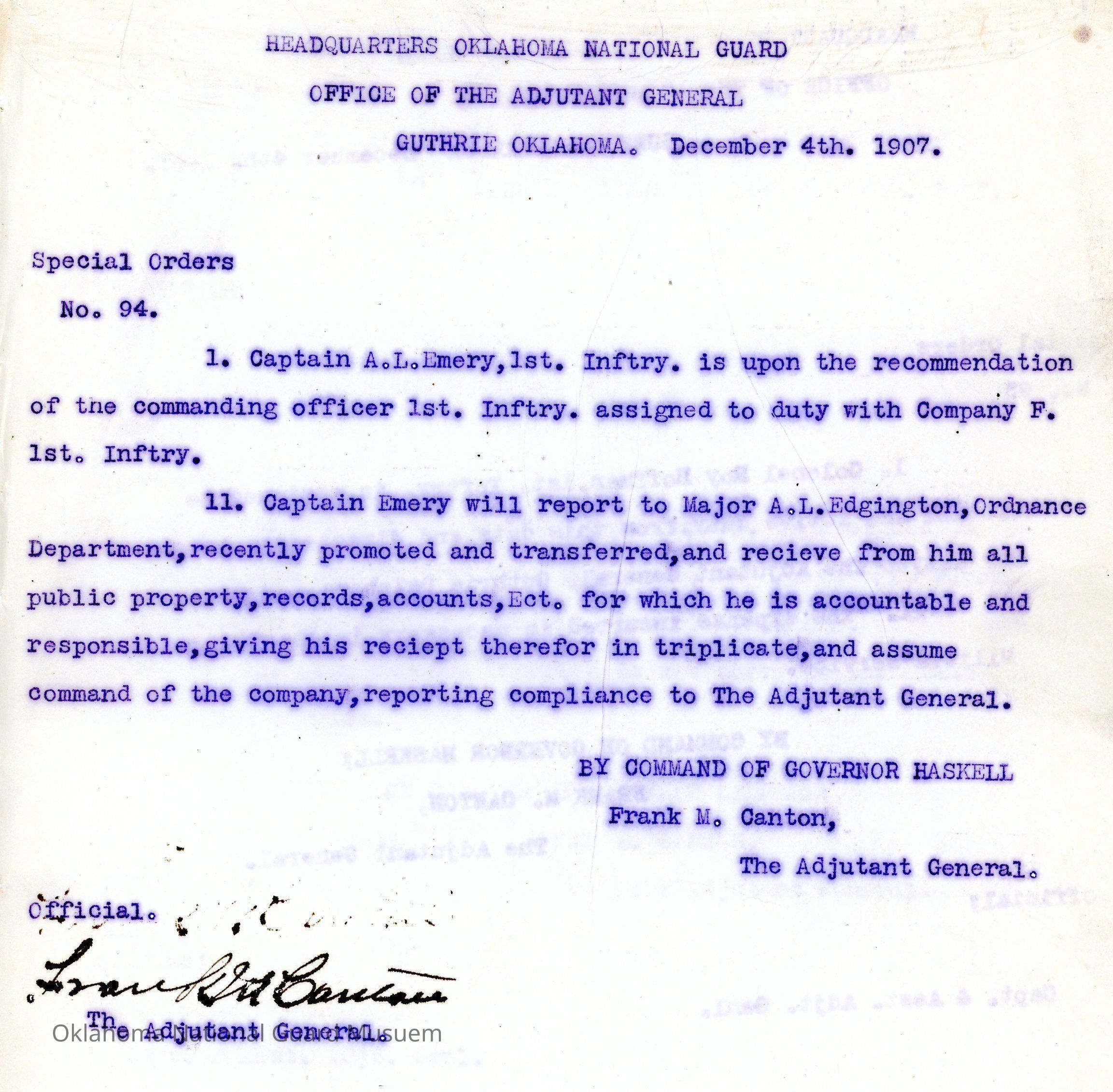 Adjutant General, Guthrie, Frank Canton, Charles N. Haskell, First Infantry, A.L. Emery, A.L. Edgington, Property, Ordnance Department