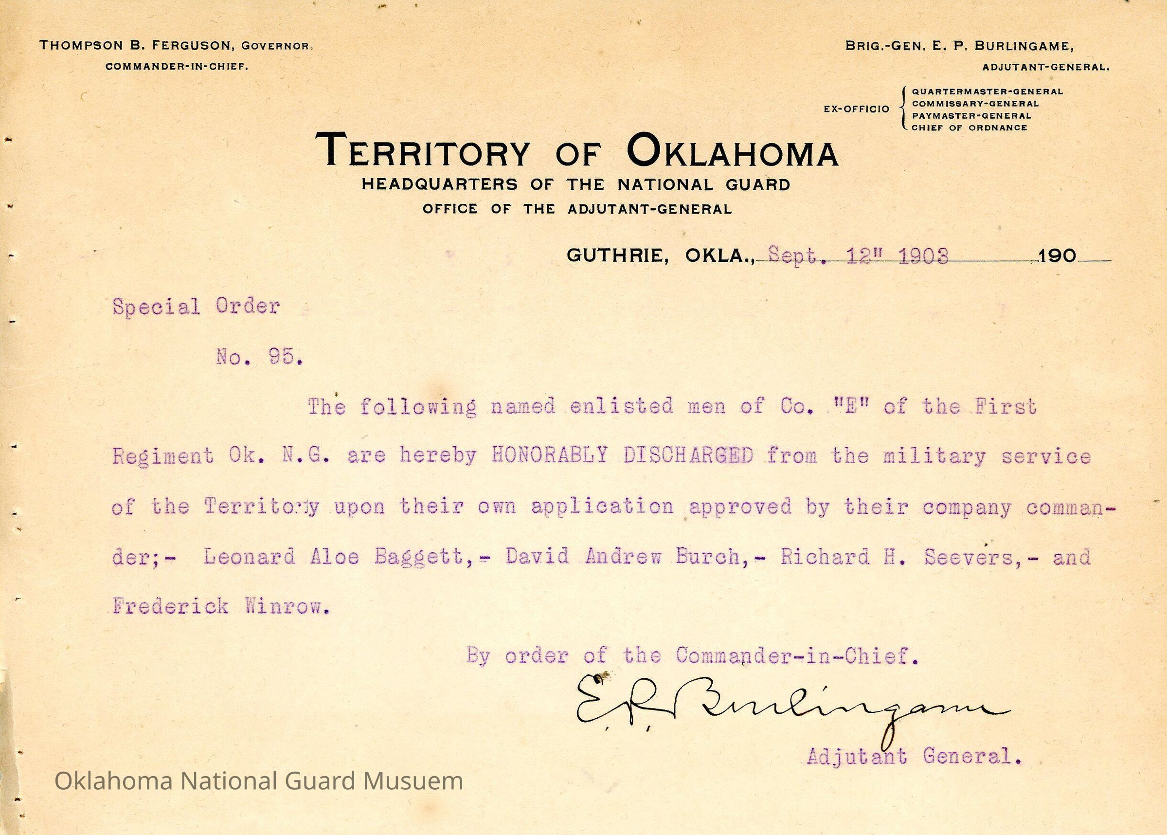 Adjutant General, Guthrie, E.P. Burlingame, Thompson B. Ferguson, First Regiment, Leonard Aloe Baggett, David Andrew Burch, Richard H. Seevers, Frederick Winrow