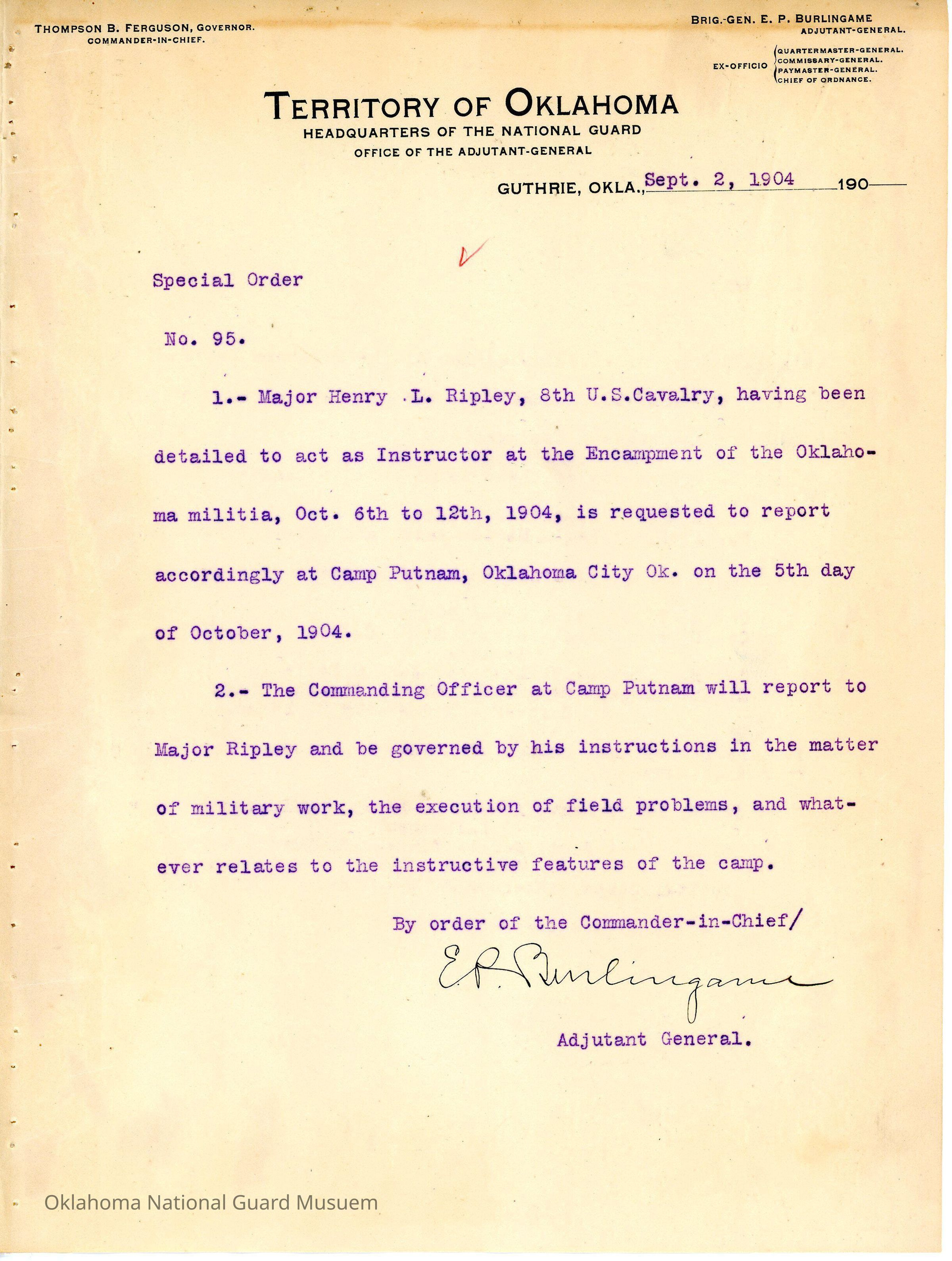 Adjutant General, Guthrie, E.P. Burlingame, Thompson B. Ferguson, Camp Putnam, Henry L. Ripley, 8th U.S. Cavalry, Instructions