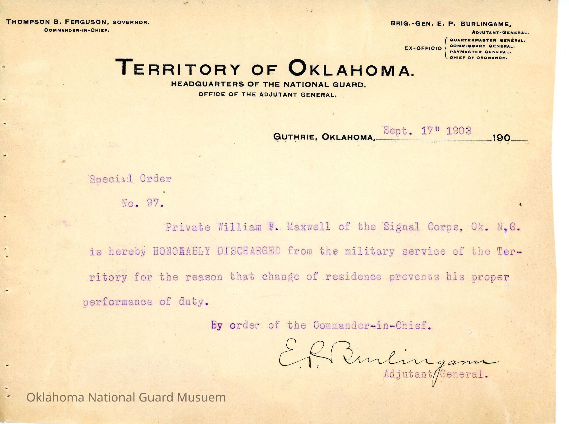Adjutant General, Guthrie, E.P. Burlingame, Thompson B. Ferguson, Signal Corps, William F. Maxwell